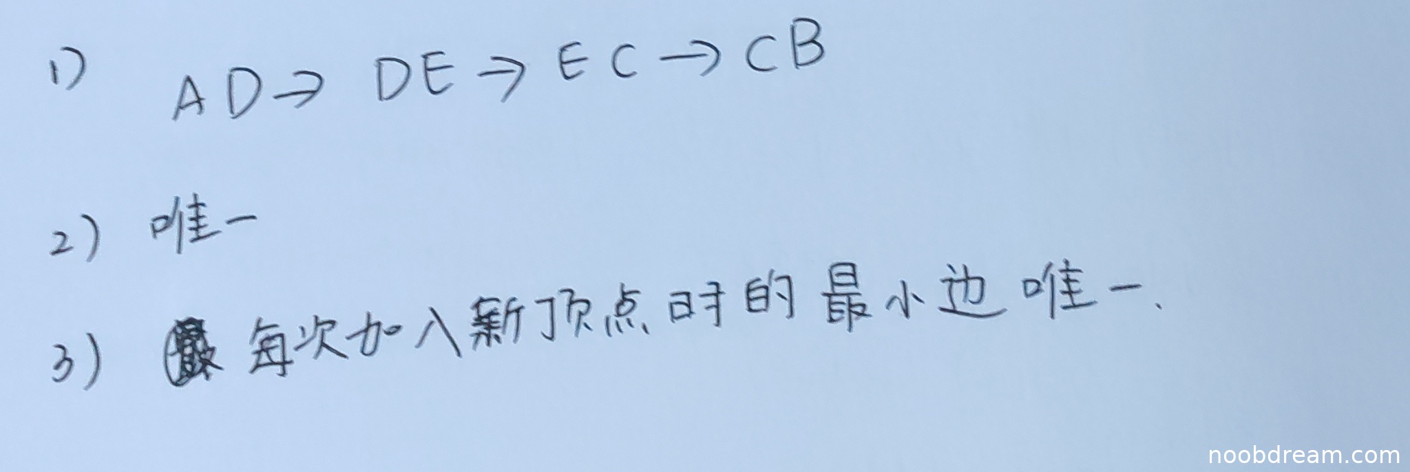 学生回答“每次加入新顶点时的最小边唯一”。这个表述虽然与标准答案“当带权连通图的任意一个环中所包含的边的权值均不相同时,其 MST 是唯一的”在字面上不完全相同,但其核心思想是等价的。在Prim算法执行过程中,如果每次选择连接已选顶点集和未选顶点集的最小权值边都是唯一的,那么最终生成的MST就是唯一的。这确实是MST唯一的一个充分条件(尽管不是最本质的图论描述,但在此语境下可以认为是正确的)。因此,不扣分,得满分2分。