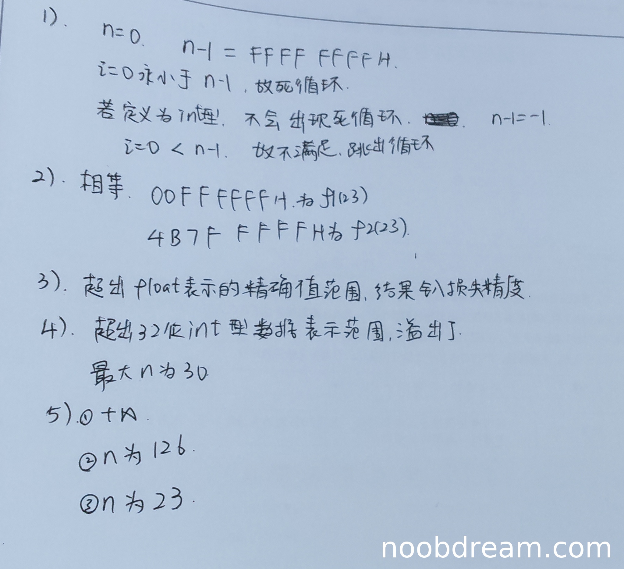 学生答案指出f1(23)和f2(23)返回值相等,正确。给出的f1(23)机器数为00FFFFFFH,正确。给出的f2(23)机器数为4B7FFFFFFH(第二次识别结果),与标准答案4B7FFFFFH存在差异(多了一个F),但根据禁止扣分规则,这可能是识别错误(如将4B7FFFFFH误识别为4B7FFFFFFH),且核心逻辑(相等、f1机器数正确、f2机器数格式基本正确)无误,因此不扣分。