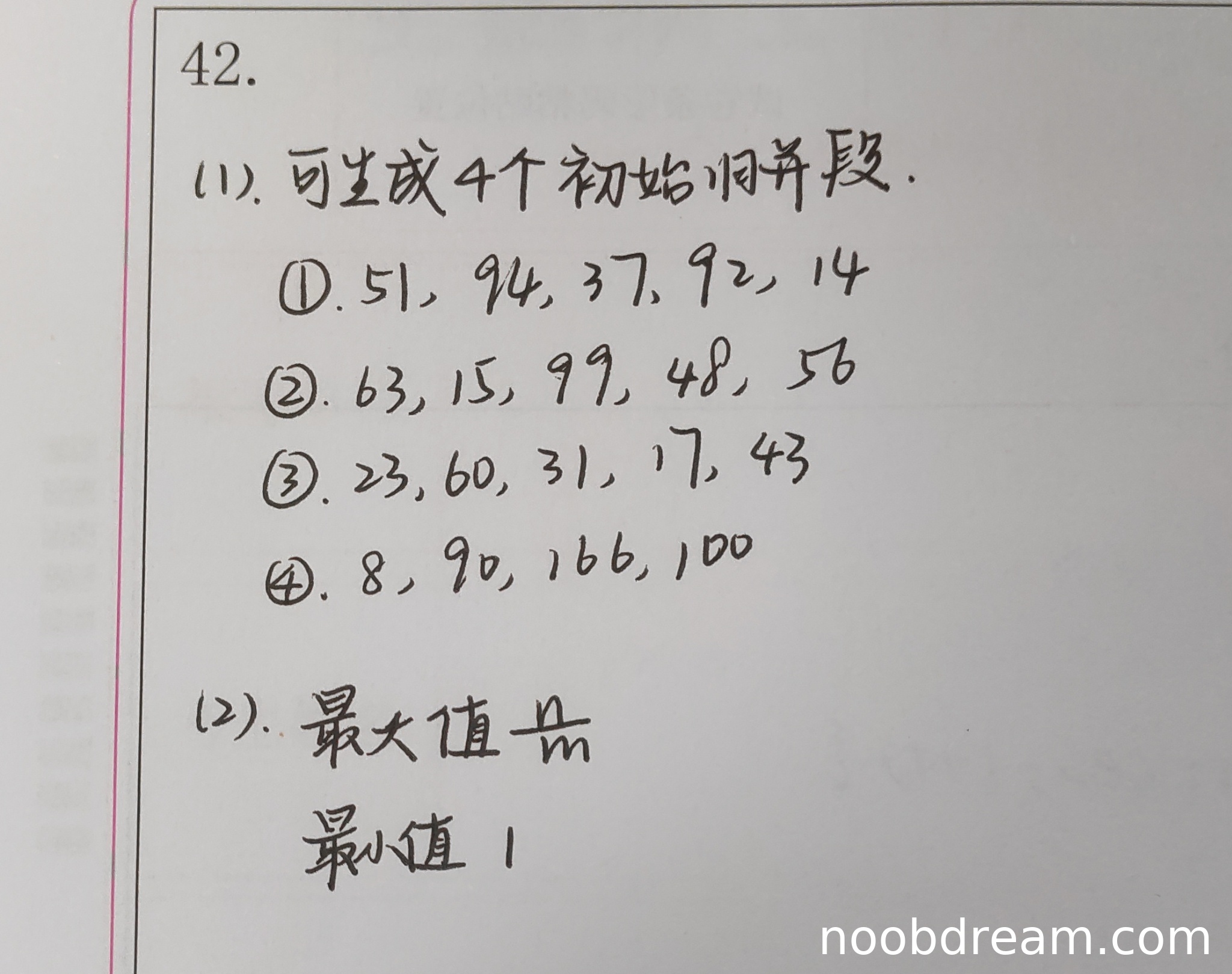 学生回答生成了4个初始归并段,并给出了具体的分段内容。但根据置换-选择排序的算法原理(使用大小为4的工作区对给定序列进行处理),正确的初始归并段应为3个,且每个归并段内部是有序的。学生的分段不仅数量错误,而且分段方式完全不符合置换-选择排序的规则(例如,第一段“51, 94, 37, 92, 14”是无序的)。这表明学生对置换-选择排序算法的理解存在根本性错误。因此,本题得分为0分。