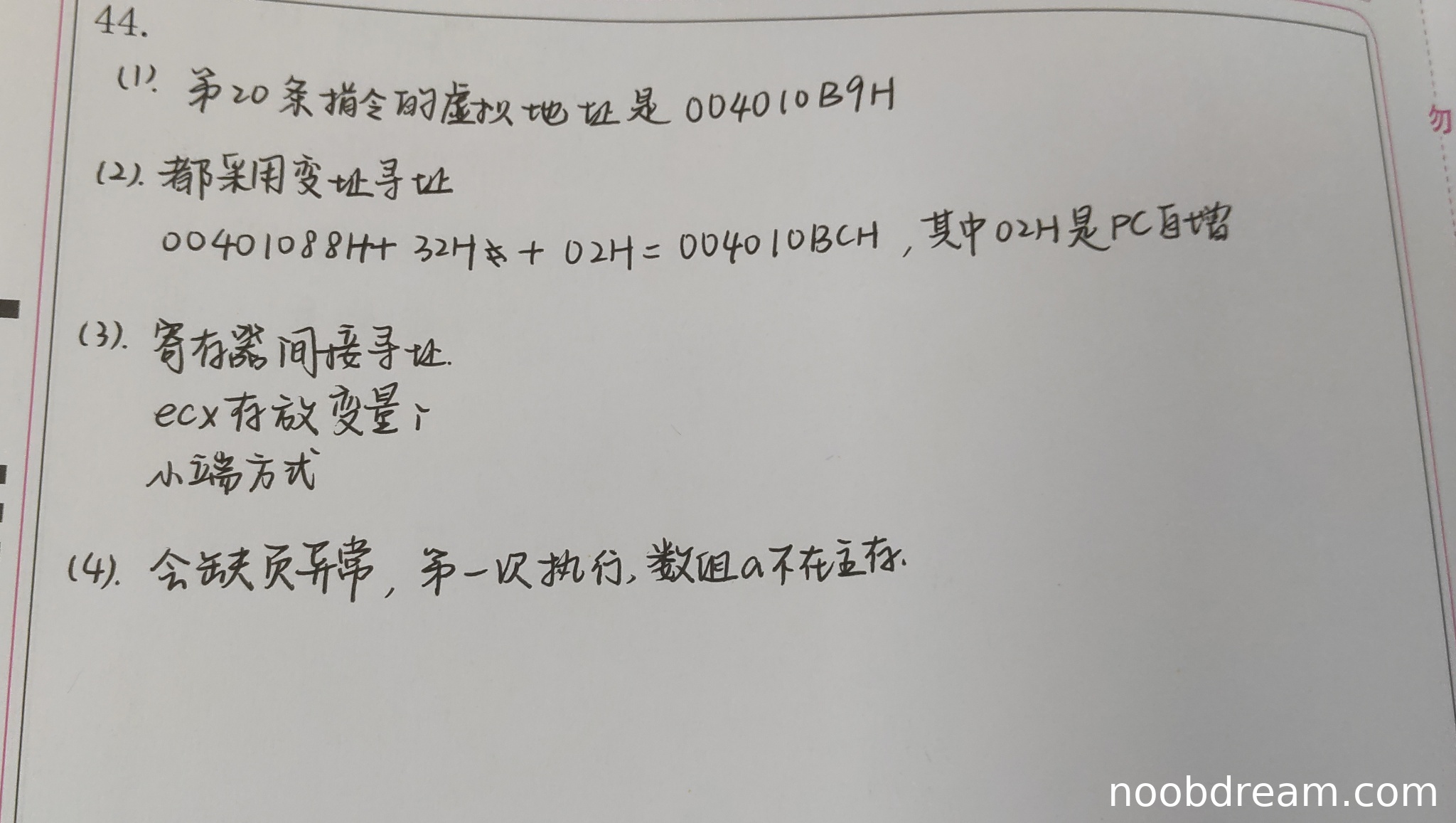 学生答案正确,第20条指令虚拟地址为004010B9H。得3分。