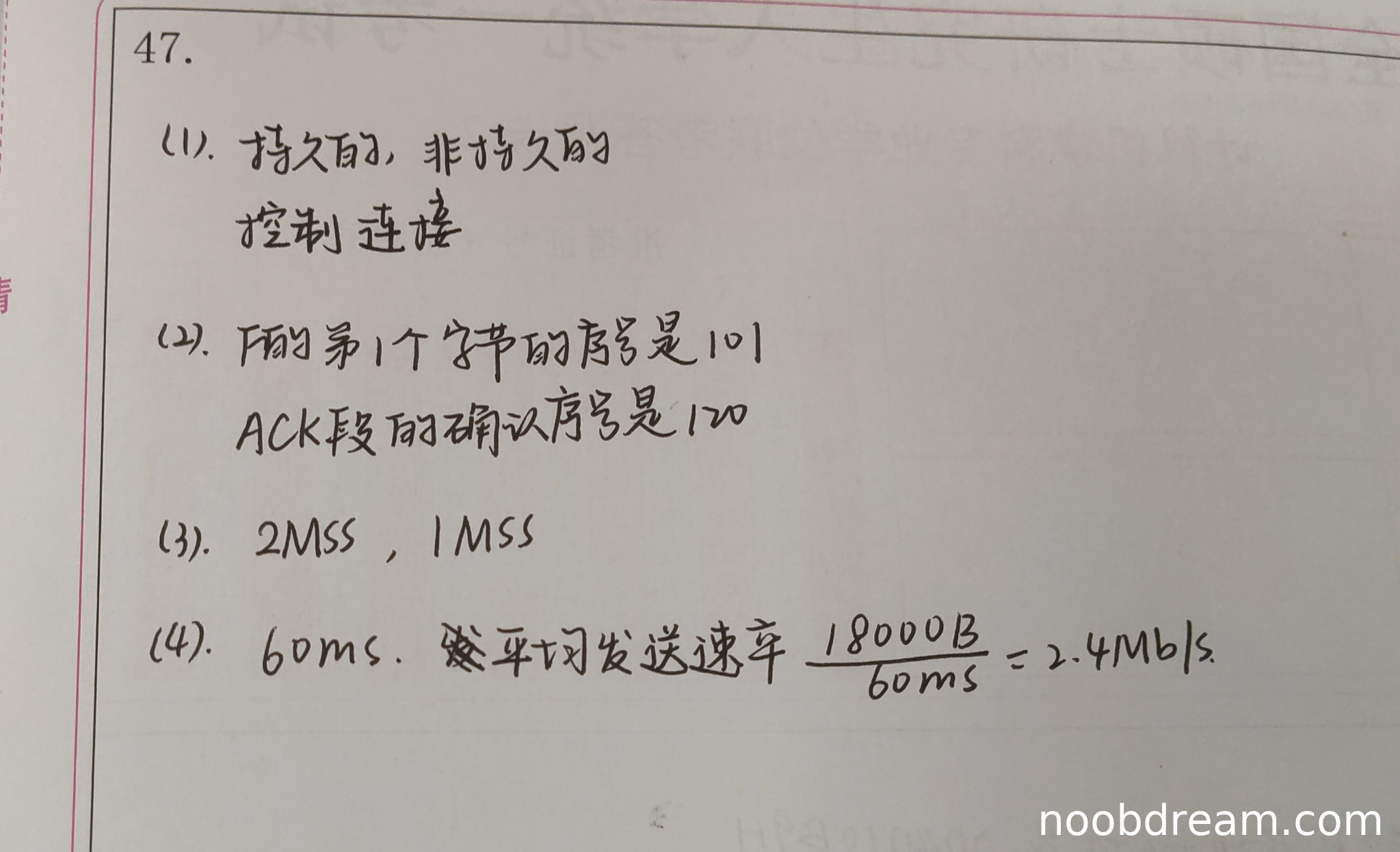 学生答案:“60ms. 平均发送速率$\frac{18000B}{60ms}=2.4Mb/s$”。