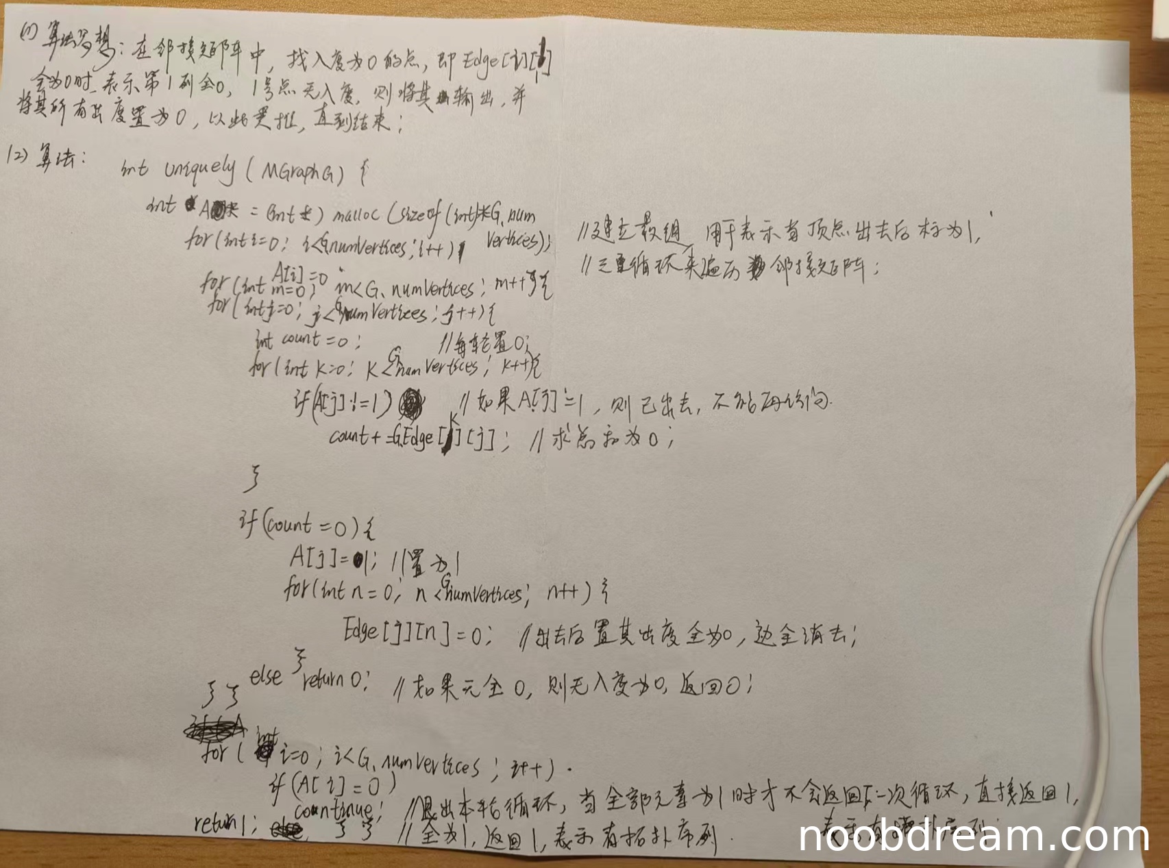 理由:学生给出的算法思想基本正确,即通过寻找入度为0的顶点进行拓扑排序,并判断是否存在多个入度为0的顶点来确定拓扑序列是否唯一。但描述中存在不准确之处:寻找入度为0的点应该是“第i行全为0”表示顶点i没有出边,但入度为0应该是“第i列全为0”(从邻接矩阵角度看,入度是列累加)。学生说“Edge[i][]全为0时,表示第i列全0”有混淆,实际应为“第i列全0表示顶点i入度为0”。不过核心思想正确,但表述不够清晰准确,扣2分。