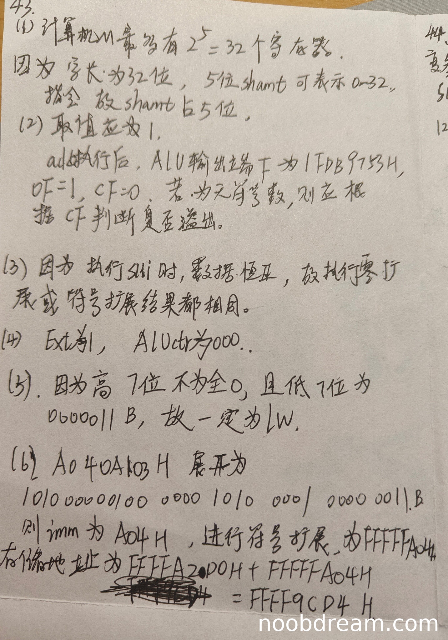 学生回答ALUBsrc取值应为1,错误(标准答案为0)。计算F=1FDB9753H正确;OF=1正确;CF=0错误(标准答案为1)。判断无符号数溢出应根据CF正确。由于ALUBsrc答错且CF计算错误,但F和OF正确,且溢出判断依据正确,部分正确。