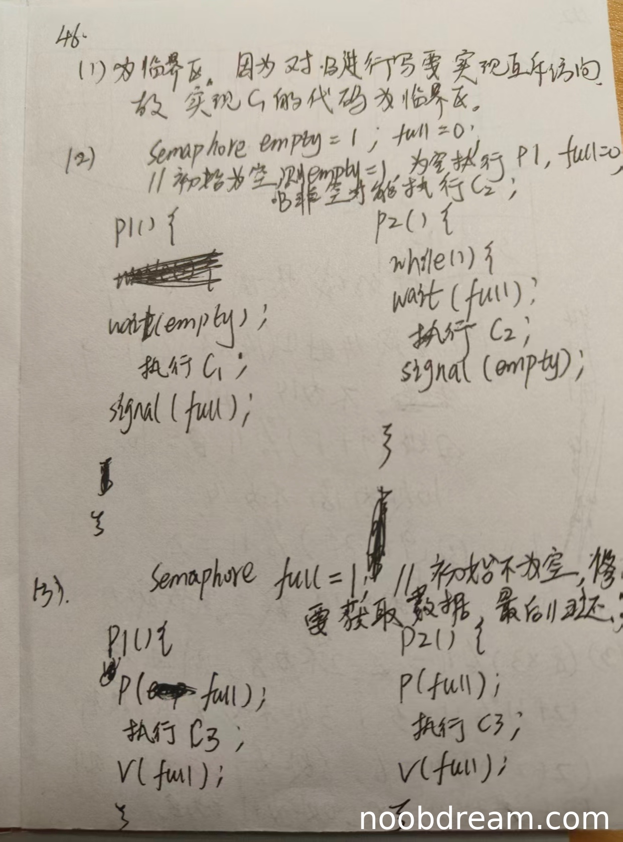 理由:学生正确理解了C3操作需要互斥访问缓冲区B。定义了一个信号量(full,作为互斥锁)并设置初值为1,在P1和P2中正确使用P/V操作(即wait/signal)包裹C3操作,确保了互斥。虽然信号量命名为`full`,但其作用与标准答案的`mutex`完全相同,思路正确,实现无误,因此得满分。