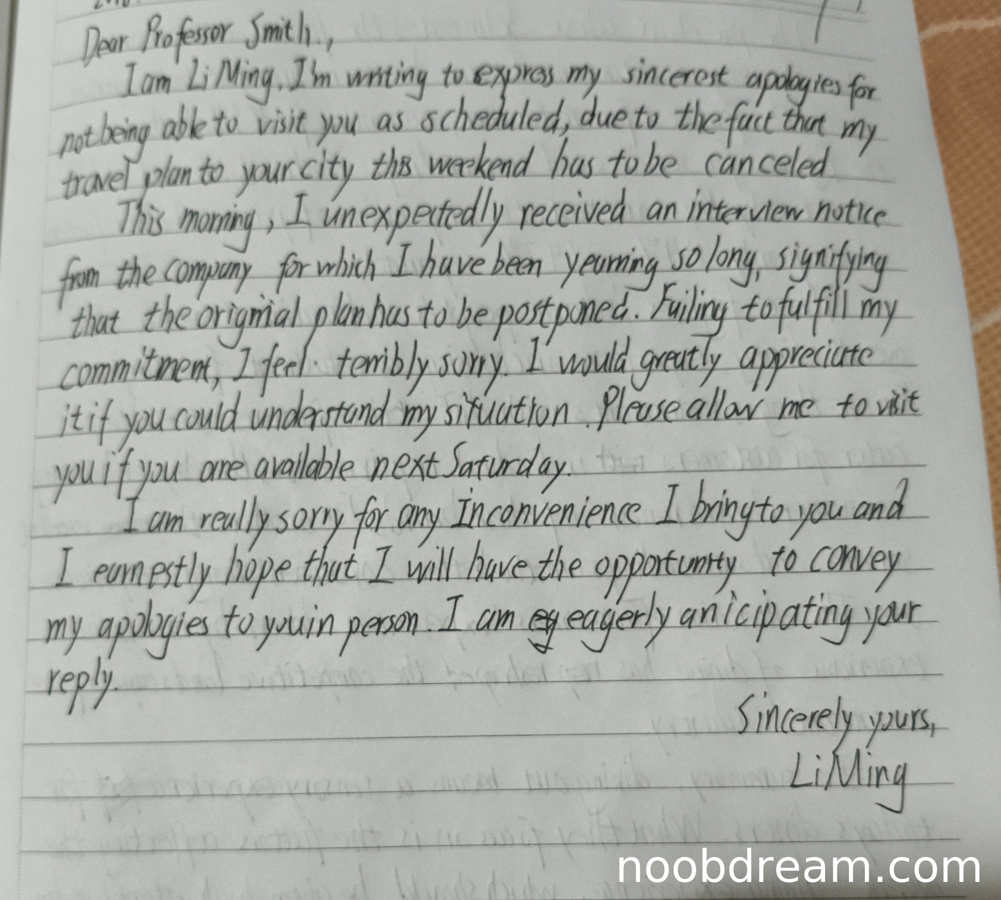 - 语言质量:语言流畅自然,词汇使用恰当(如“express my sincerest apologies”, “yearning so long”, “convey my apologies in person”),语法错误极少,句子结构多样,符合正式书信的语域要求。