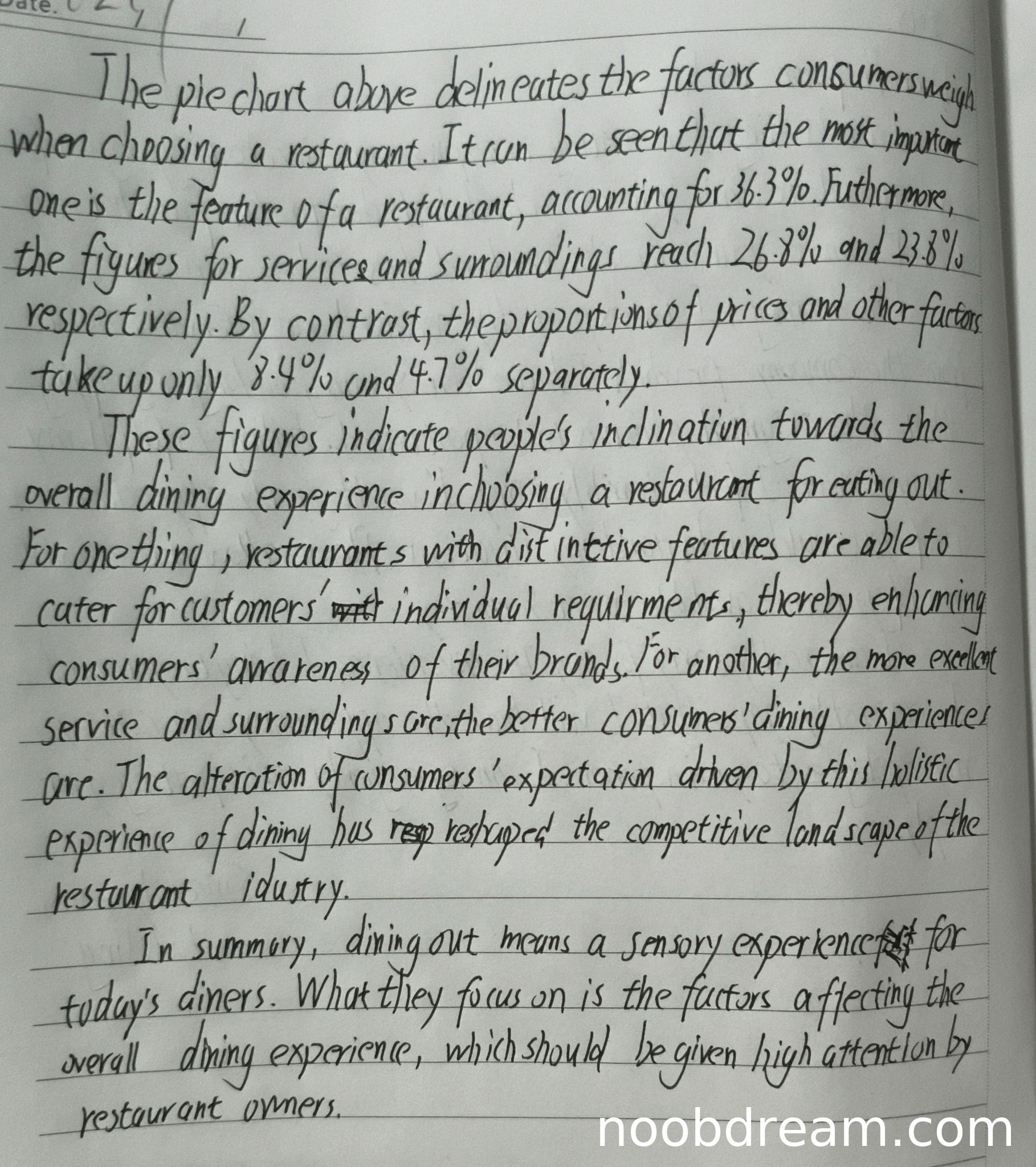 该作文很好地完成了试题规定的任务。首先,第一段准确、清晰地描述了饼图中的所有关键数据(特色36.3%,服务26.8%,环境23.8%,价格8.4%,其他4.7%),完成了“interpret the chart”的要求。其次,第二段和第三段进行了有效的评论,分析了消费者关注特色、服务和环境的原因,并指出这种对整体用餐体验的追求正在重塑餐饮业的竞争格局,最后对餐厅经营者提出了建议。文章结构完整,包含引言、描述、分析和结论。