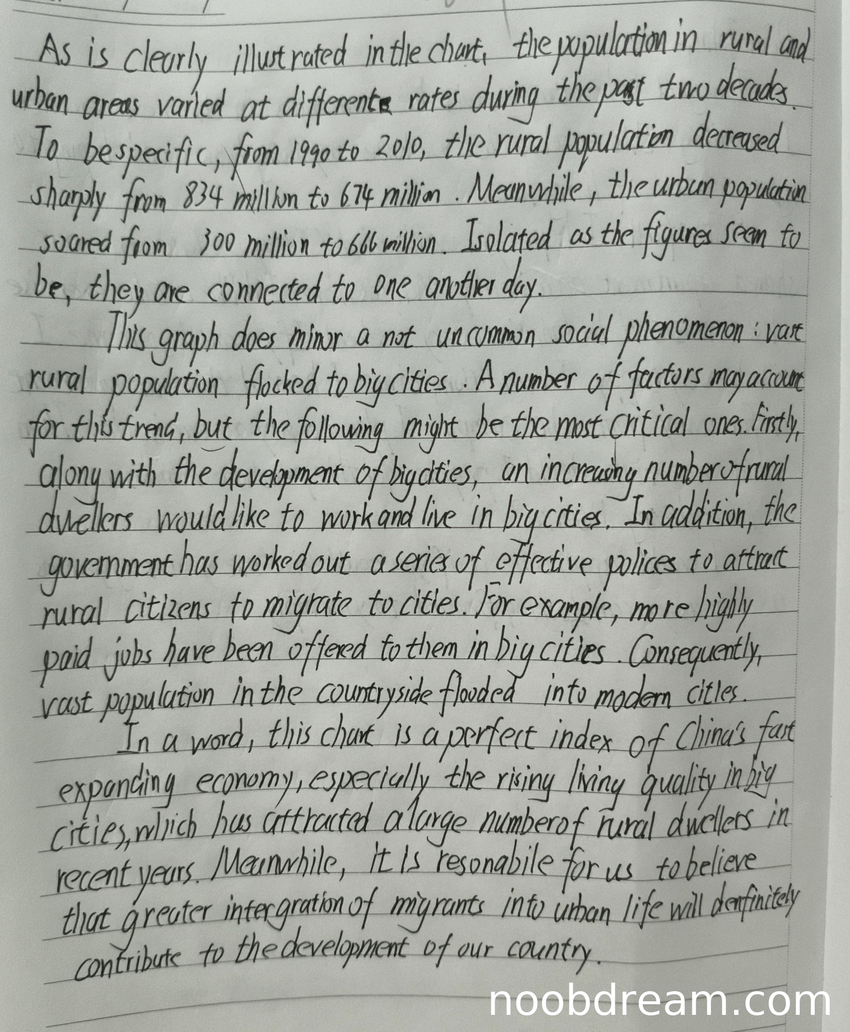 该生作文很好地完成了试题规定的任务。首先,文章准确、清晰地描述了图表的主要信息,包括1990年至2010年间城镇人口上升和乡村人口下降的具体数据变化。其次,文章给出了恰当的评论,从城市发展、政府政策等角度分析了这一趋势的原因,并展望了其积极意义。文章结构完整,包含引言(描述图表)、主体(分析原因)和结论(总结与展望)。语言流畅,使用了丰富的语法结构(如非限制性定语从句、倒装句“Isolated as the figures seem to be”)和词汇(如soared, flocked, mirror, index, integration)。衔接手法有效,如使用“To be specific”, “Firstly”, “In addition”, “Consequently”, “In a word”等连接词使文章层次清晰。格式与语域(议论文体)恰当贴切。虽有极个别拼写小误(如第一次识别中的“polices”应为“policies”),但不影响理解,且第二次识别已纠正。综合来看,符合第一档(13-15分)标准,给予14分。