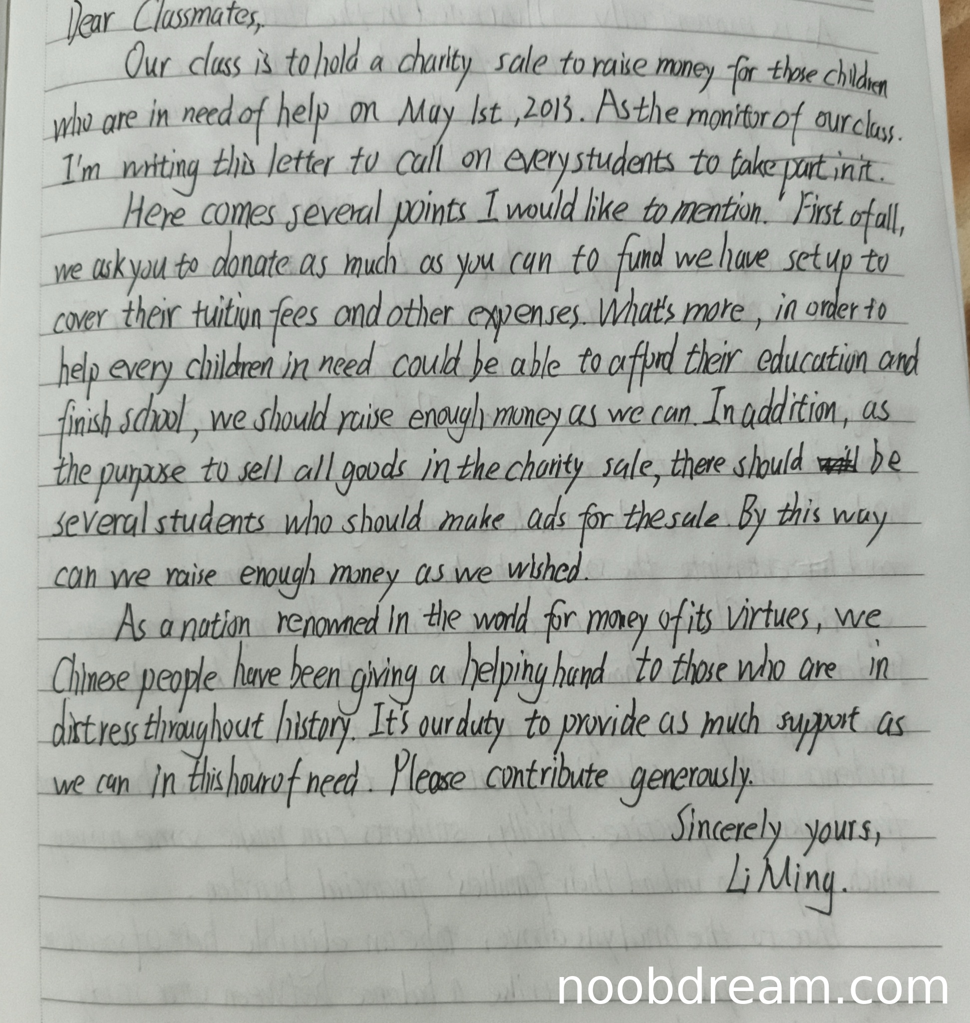 - 内容要点:题目要求1)告知活动细节,2)鼓励参与。学生作答明确提到了活动(慈善义卖)、时间(2013年5月1日)、目的(为需要帮助的儿童筹款)、具体呼吁(捐款、做广告)以及鼓励性话语,基本覆盖了所有要点。但细节部分(如“make ads for the sale”)略显模糊,未明确说明义卖的具体形式或地点。