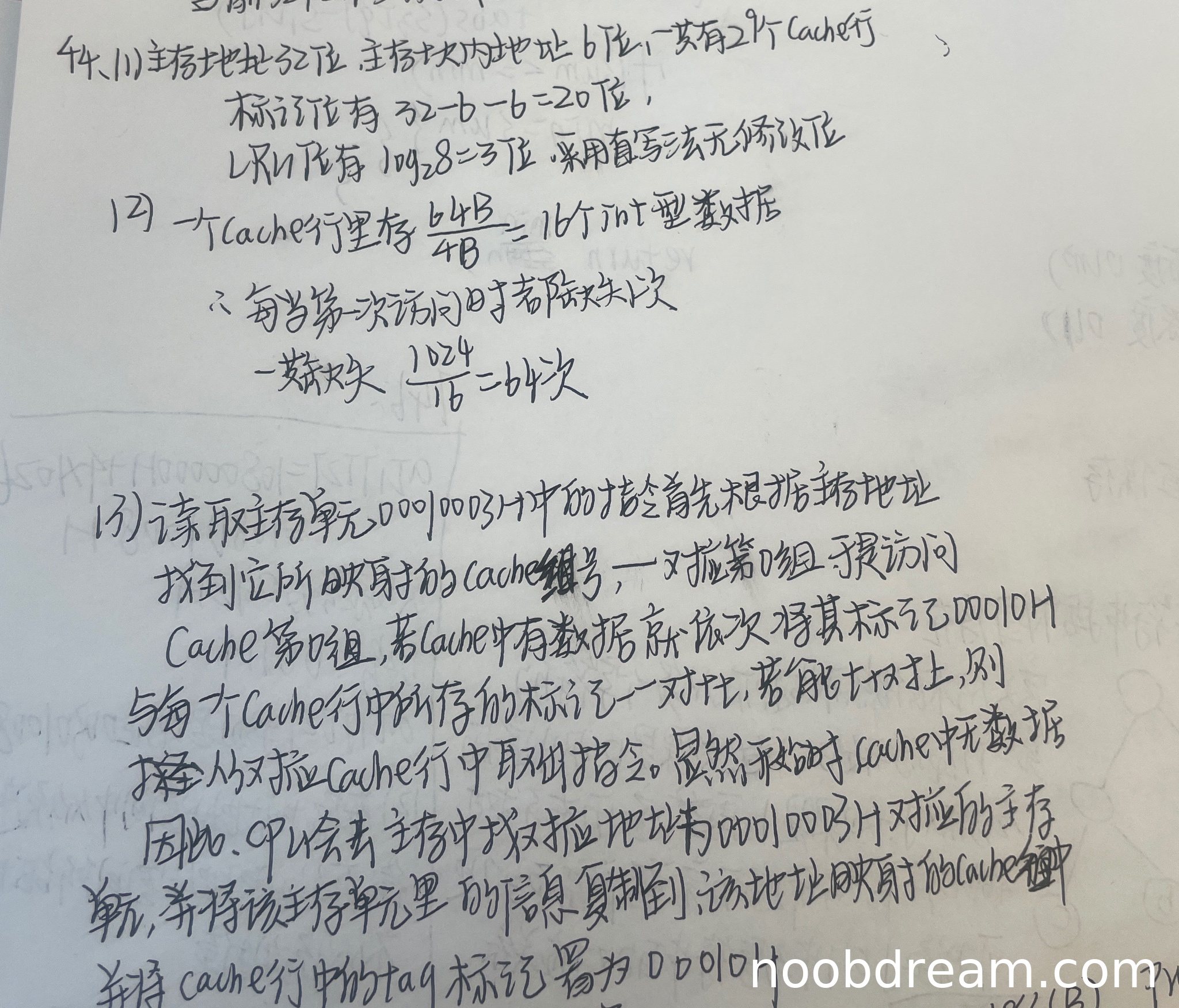 学生描述了根据地址找到对应Cache组(第0组),进行标记比较,发现缺失后访问主存,并将数据块调入Cache并设置标记的过程。过程描述完整,符合Cache访问流程。虽然标记“00010H”的写法不够规范(应为20位,例如00010H可能表示高20位的一部分),但根据上下文可理解其意图,且核心逻辑正确,不扣分。