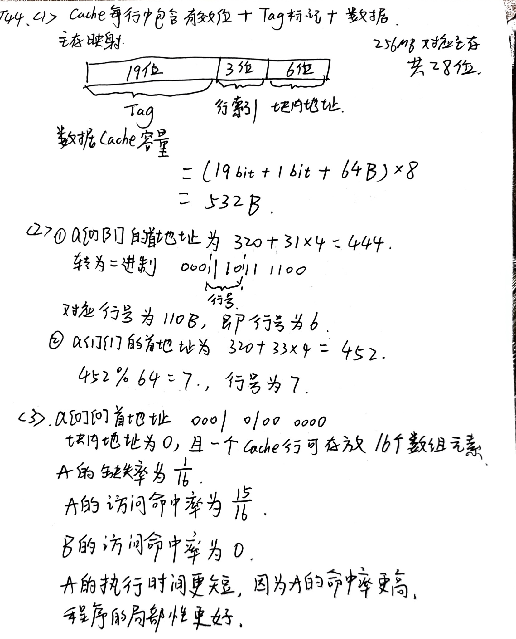 学生答案正确计算了数据Cache的总容量为532B。虽然第一次识别中写成了“19bit+16bit+64B”,但第二次识别修正为“19 bit + 1 bit + 64B”,且最终结果与标准答案一致。核心逻辑和计算结果正确,得3分。