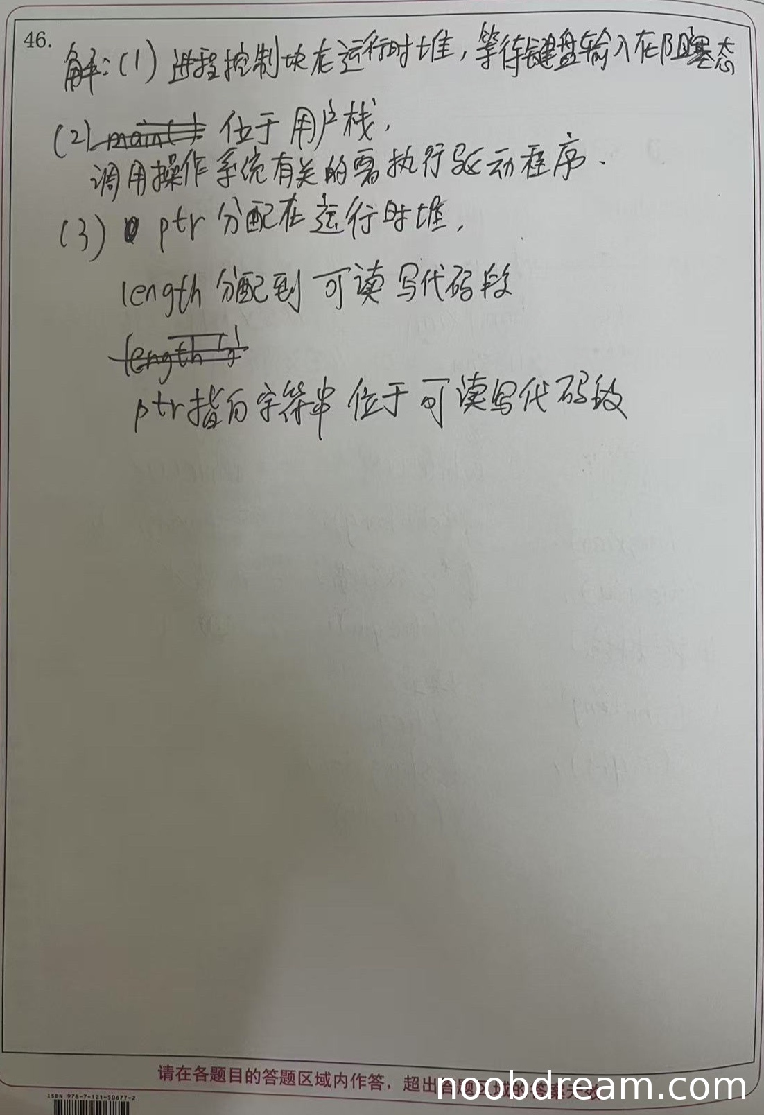 理由:进程控制块(PCB)是操作系统内核管理进程的数据结构,应位于内核区,而非运行时堆。此处回答错误,扣1分。执行scanf()等待键盘输入时,进程处于阻塞态,此部分回答正确,得1分。因此本小题得1分。