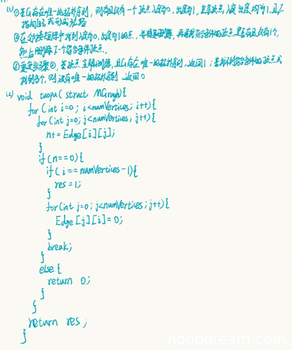得分:0分。理由:学生提供的代码存在严重逻辑错误,且与拓扑排序算法不符。具体问题包括:①函数名为tuopu,而非题目要求的uniquely;②函数参数类型错误(struct MGraph应为MGraph G);③未定义变量n、res,且n的计算错误(内层循环中n被重复赋值,未累加);④算法逻辑混乱,仅检查当前行是否全为0(即出度是否为0),但拓扑排序应检查入度;⑤未实现入度计算和更新过程;⑥返回值逻辑错误。整体代码无法正确判断拓扑序列的唯一性,因此不得分。
