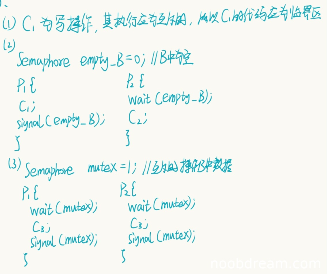 学生答案正确。对于C3操作(修改数据),需要互斥访问缓冲区B。学生定义了一个互斥信号量mutex,初值为1,并在P1和P2的C3操作前后正确使用了wait和signal操作。思路与标准答案完全一致。