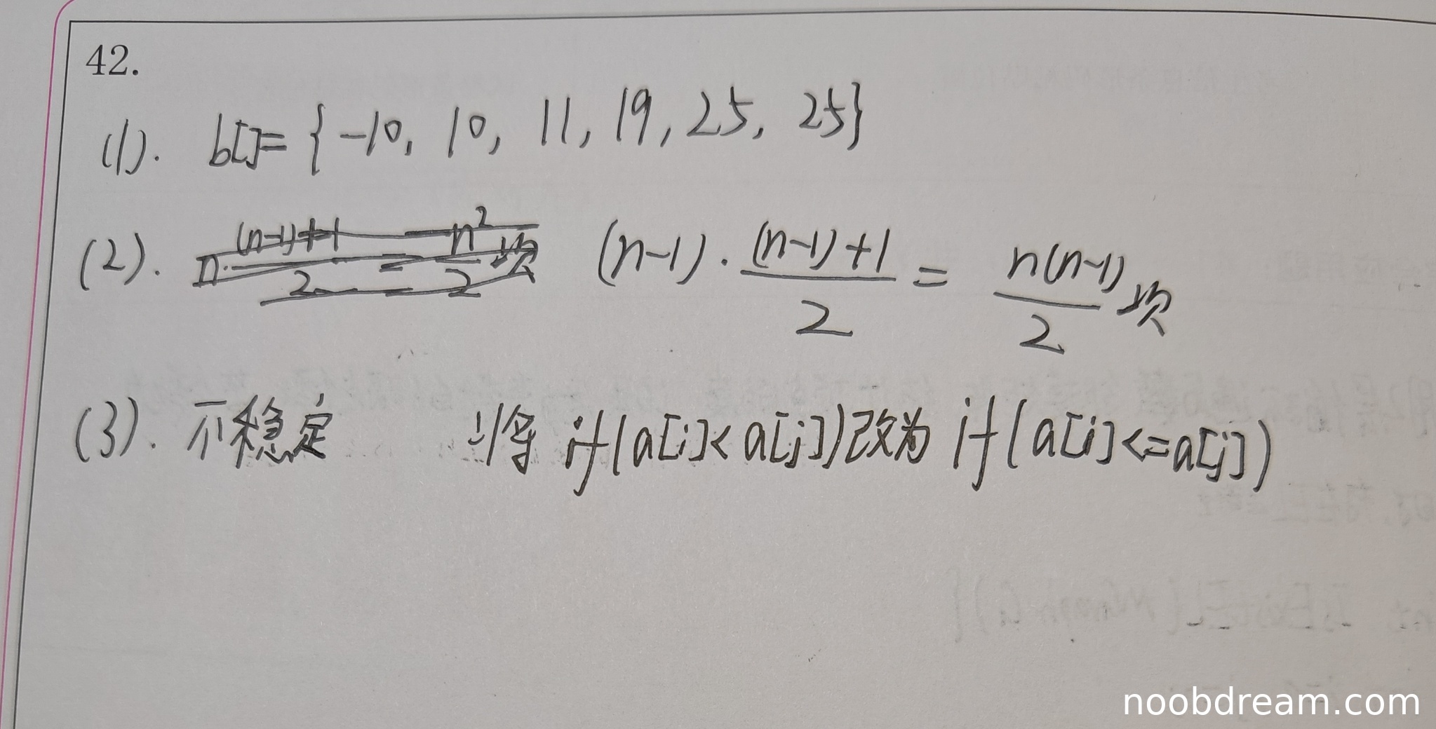 学生第二次识别结果中,给出了“$\frac{n(n - 1)}{2}$项”,虽然表述为“项”不够准确,但核心的比较次数公式 n(n-1)/2 是正确的。根据“思路正确不扣分”原则,以及“对置信度低的回答,存在识别错误的可能性较高”的考虑,将“项”视为识别或表述瑕疵,不扣分。得2分。