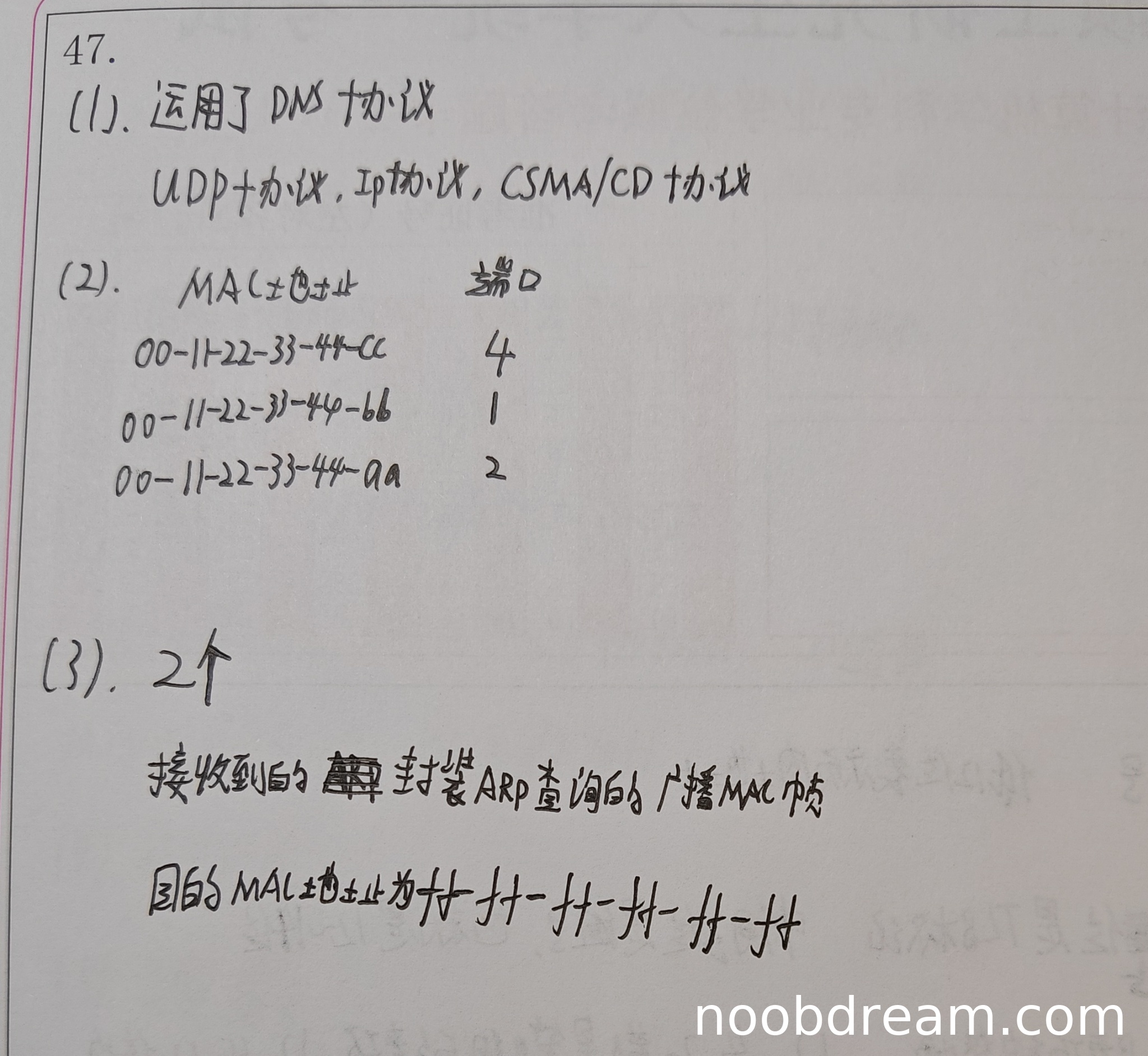 学生答案的交换表内容基本正确,列出了三个条目。其中,第二个条目的MAC地址“00-11-22-33-44-66”与标准答案的“00-11-22-33-44-bb”不符。根据拓扑图,本地域名服务器的MAC地址应为“00-11-22-33-44-bb”,学生答案中的“66”可能是对字符“b”的误识别(例如将手写体“b”识别为“6”)。根据题目要求,对于识别错误导致的字符误写,若判断为误写则不扣分。此处MAC地址格式和端口号正确,且上下文逻辑(记录本地域名服务器的MAC地址到端口1)正确,因此判定为误写,不扣分。得3分。