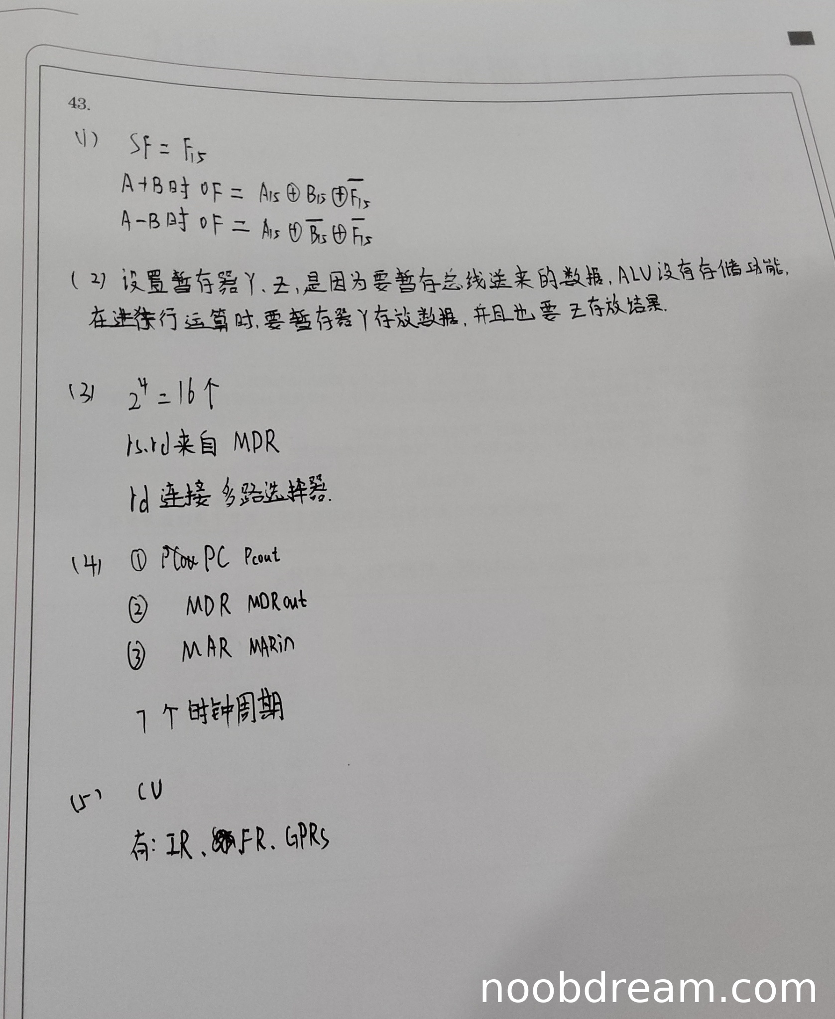 第二问:A+B时OF的逻辑表达式,学生给出的是异或形式,但标准答案是逻辑与或形式。实际上,对于补码加法,OF = A₁₅·B₁₅·F̅₁₅ + A̅₁₅·B̅₁₅·F₁₅,而学生写为A₁₅ ⊕ B₁₅ ⊕ F₁₅,这是不正确的(正确的异或形式应为A₁₅ ⊕ B₁₅ ⊕ C₁₄,其中C₁₄是次高位进位,但题目要求用A₁₅、B₁₅、F₁₅表示)。因此扣1分。