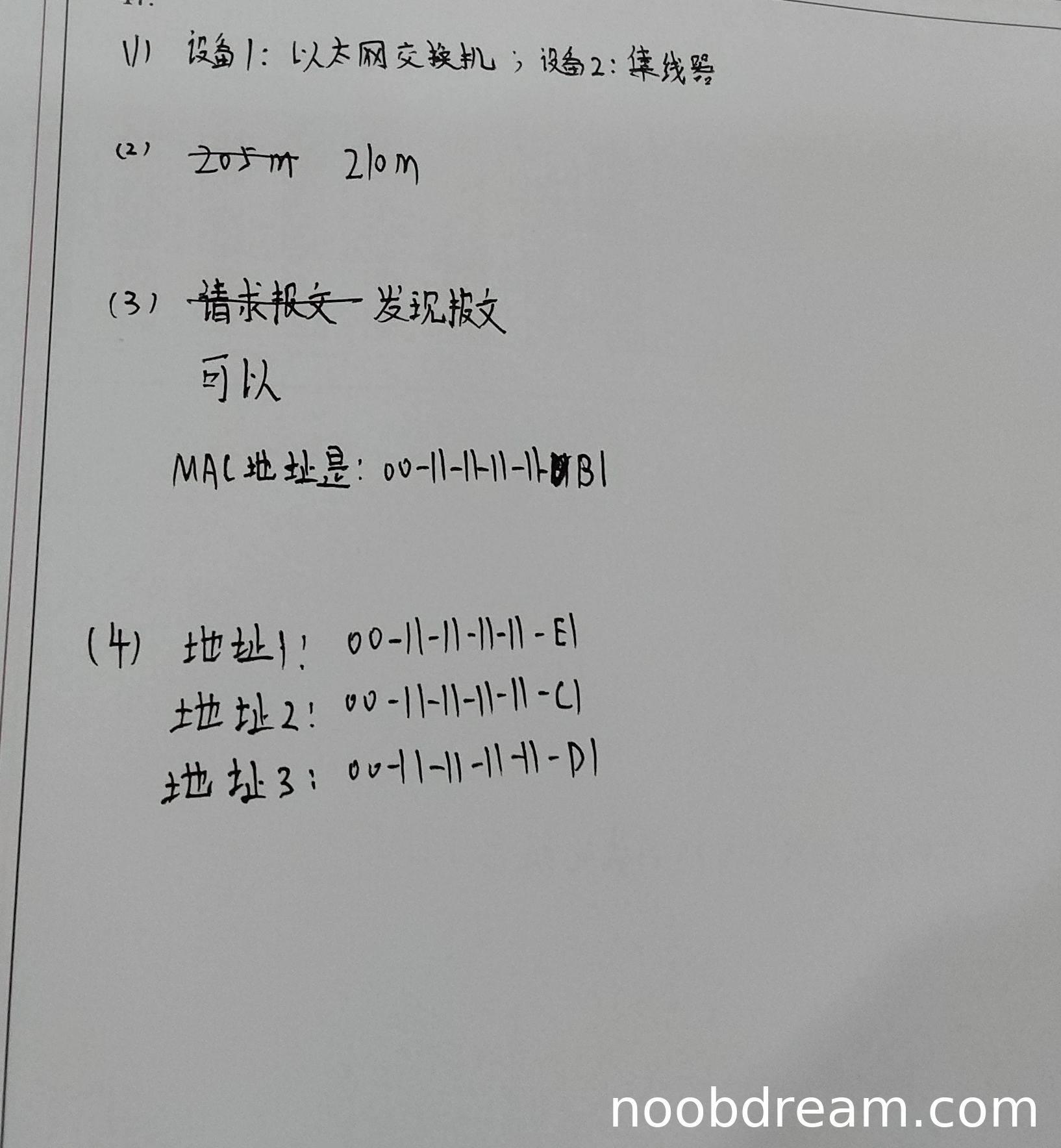 第三问:S转发的帧的目的MAC地址?学生答案为“00-11-11-11-11-B1”,这是DHCP服务器的MAC地址。但标准答案为广播地址“FF-FF-FF-FF-FF-FF”。DHCP客户端初始发送的DISCOVER报文是广播帧,交换机S在未知目的MAC或处理广播帧时,会以广播方式转发,目的MAC应为全1。学生的答案是一个具体的单播MAC地址,这是逻辑错误。