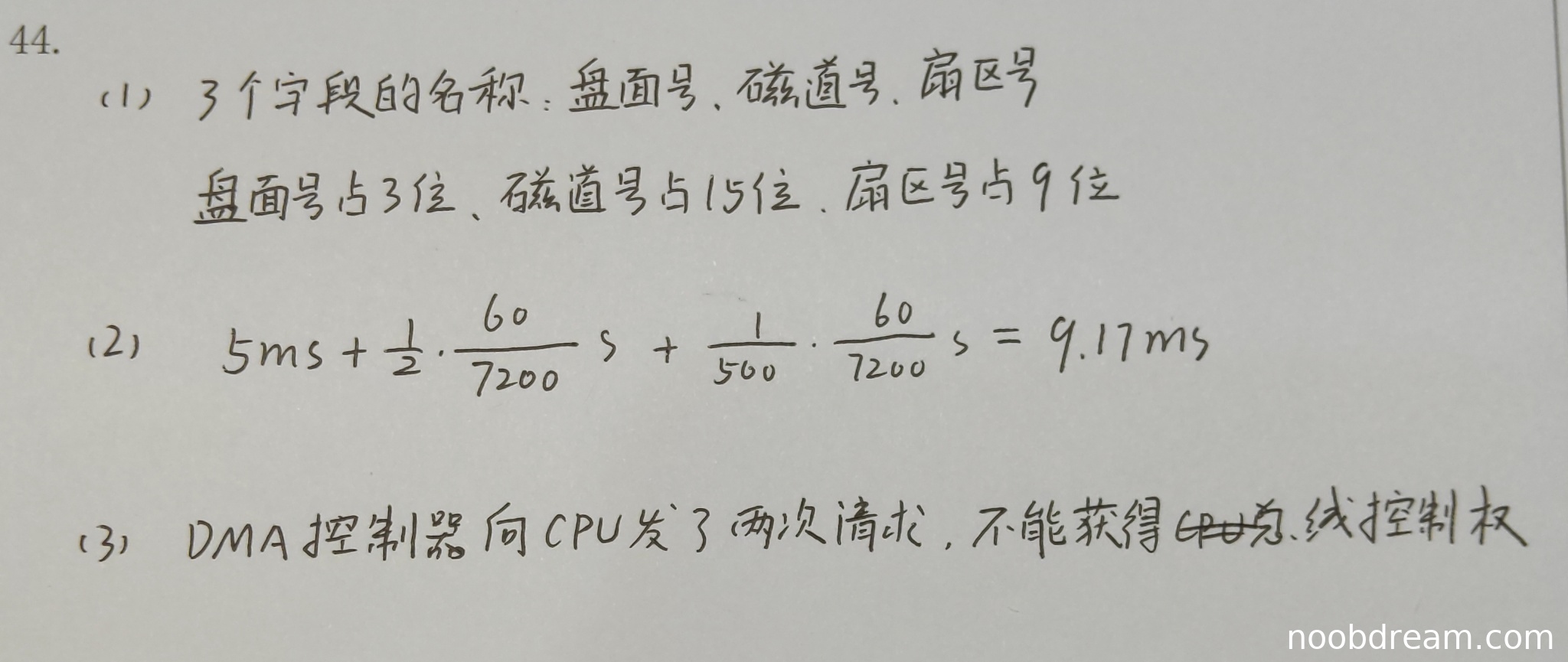 学生计算了平均访问时间,公式和思路正确。第一次识别结果为9.17ms,第二次识别结果为9.17ms(虽然公式中写成了1/560,但计算结果与标准答案9.183ms非常接近,可以认为是计算过程中的近似或识别误差)。考虑到计算题允许合理的近似,且核心计算步骤(平均寻道时间、平均旋转延迟、传输时间)均已体现,因此得满分2分。