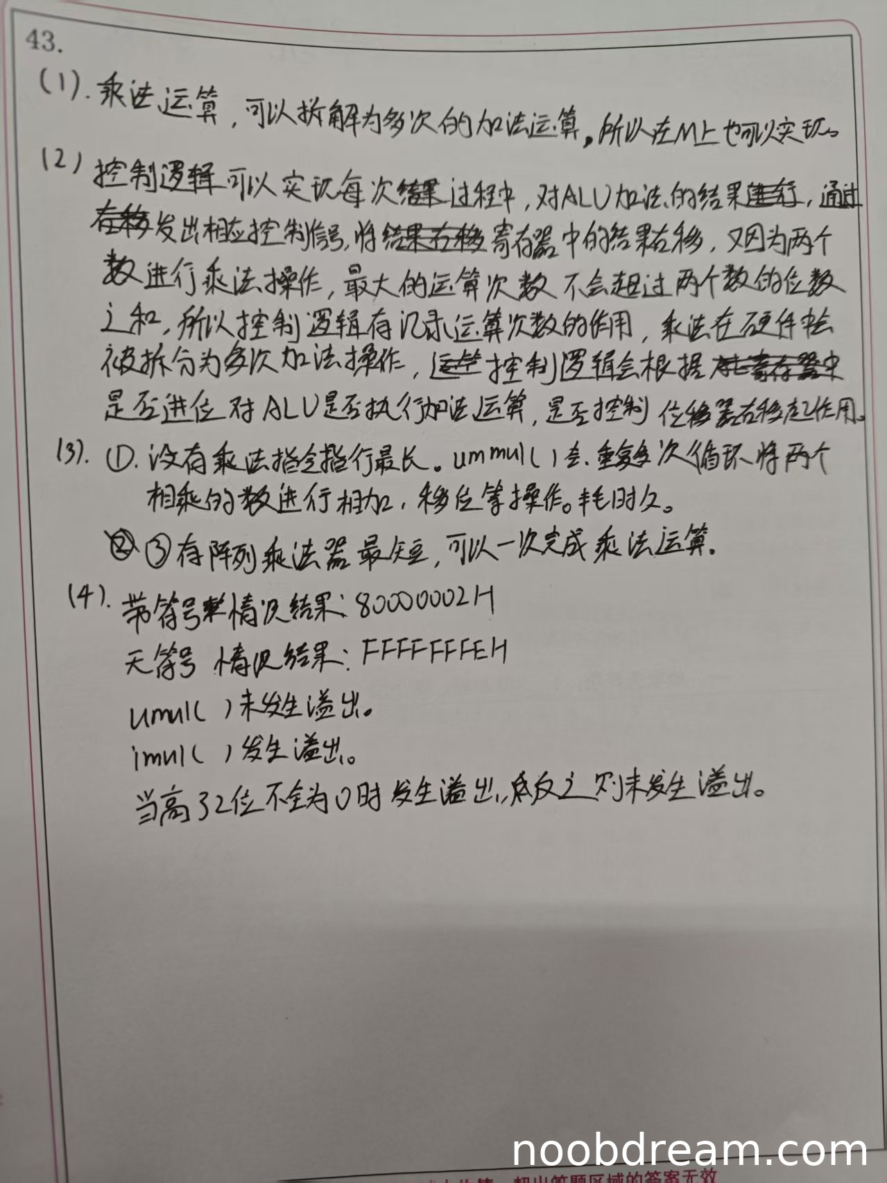 第三问:学生回答“当高32位不为0时发生溢出,反之则未发生溢出。” 这与标准答案“若乘积高n位全为0,则无溢出,否则溢出”本质一致(对于无符号乘法,高n位不为0即溢出)。得1分。