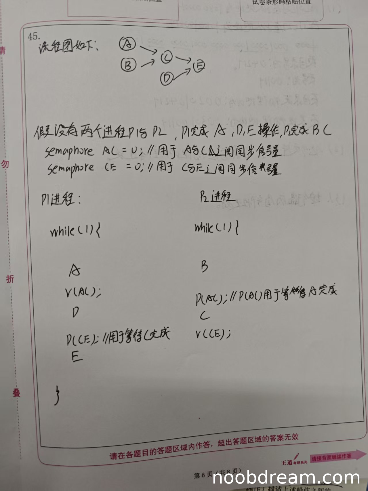 - 逻辑错误:题目要求操作C必须在A和B都完成后执行,但学生的方案中,P2进程(执行B和C)通过P(AC)只等待了A完成,没有等待B完成。实际上,B和A是并发执行的,但C在B执行后没有等待B完成的同步机制(因为B和C在同一个进程内顺序执行,这隐含了B在C之前,但缺少了对A的等待的显式同步)。然而,学生的方案中,P(AC)信号量由A操作后V(AC)置位,P2中P(AC)等待A完成,但C的执行还依赖于B的完成,而B在同一个进程中,所以C确实在B之后执行,但缺少了对A和B都完成的明确同步保证(因为如果A很慢,P2可能阻塞在P(AC),然后执行B和C;但如果A很快,P2可能先执行B,然后阻塞在P(AC)等待A,这可能导致C在A完成前就执行了B,但C必须等待A和B都完成,这里逻辑不严谨)。更严重的是,学生的方案中,P1进程执行A、D、E,P2进程执行B、C,但操作E必须在C和D完成后执行,而学生的P1中,E之前只P(CE)等待C完成,没有等待D完成(因为D在P1中在A之后、P(CE)之前执行,所以D肯定在E之前执行,但缺少显式同步,且如果D执行时间很长,可能影响E的执行顺序,但逻辑上D在E之前执行是满足的)。然而,学生的方案中缺少了D和E之间的同步信号量,标准答案中需要S_DE信号量,这里缺失。