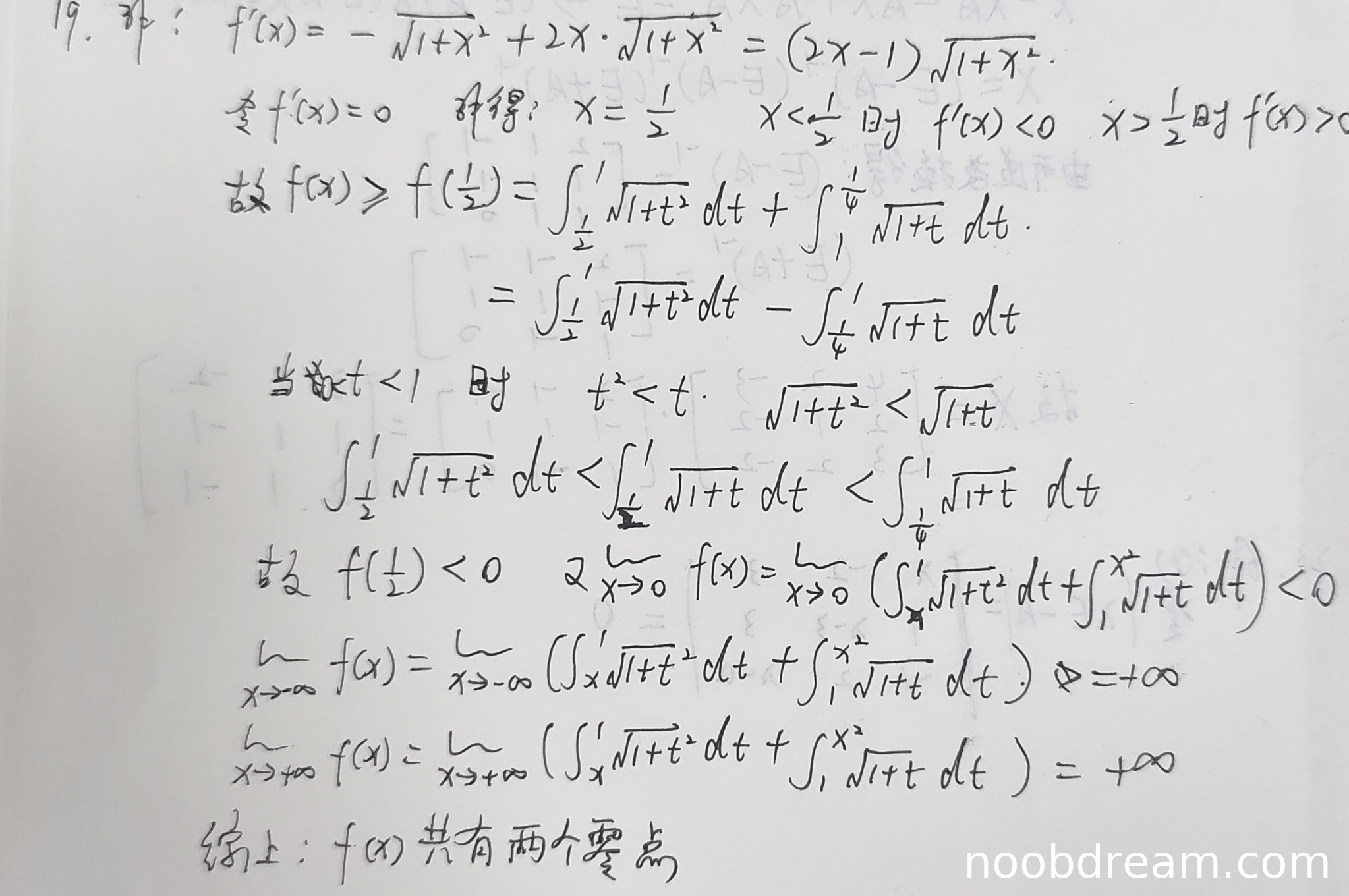 - 在第一次识别结果中,计算 \(f(\frac{1}{2})\) 时写为 \(\int_{1}^{\frac{1}{4}}\sqrt{1+t}dt\),但在后续比较积分时,错误地写成了 \(\int_{\frac{1}{2}}^{1}\sqrt{1+t^{2}}dt<\int_{\frac{1}{2}}^{1}\sqrt{1+t}dt<\int_{\frac{1}{4}}^{1}\sqrt{1+t}dt\),并由此得出 \(f(\frac{1}{2})<0\)。虽然结论正确,但中间的比较逻辑不够严谨(标准答案通过拆分积分区间并比较被积函数来严格证明)。不过,学生抓住了核心:在 \(t \in (\frac{1}{2}, 1)\) 时 \(\sqrt{1+t^2} < \sqrt{1+t}\),且 \(\int_{\frac{1}{4}}^{\frac{1}{2}} \sqrt{1+t} dt > 0\),因此 \(f(\frac{1}{2}) < 0\) 的结论是合理的。此处逻辑表述有瑕疵,但不影响最终结论,扣1分。