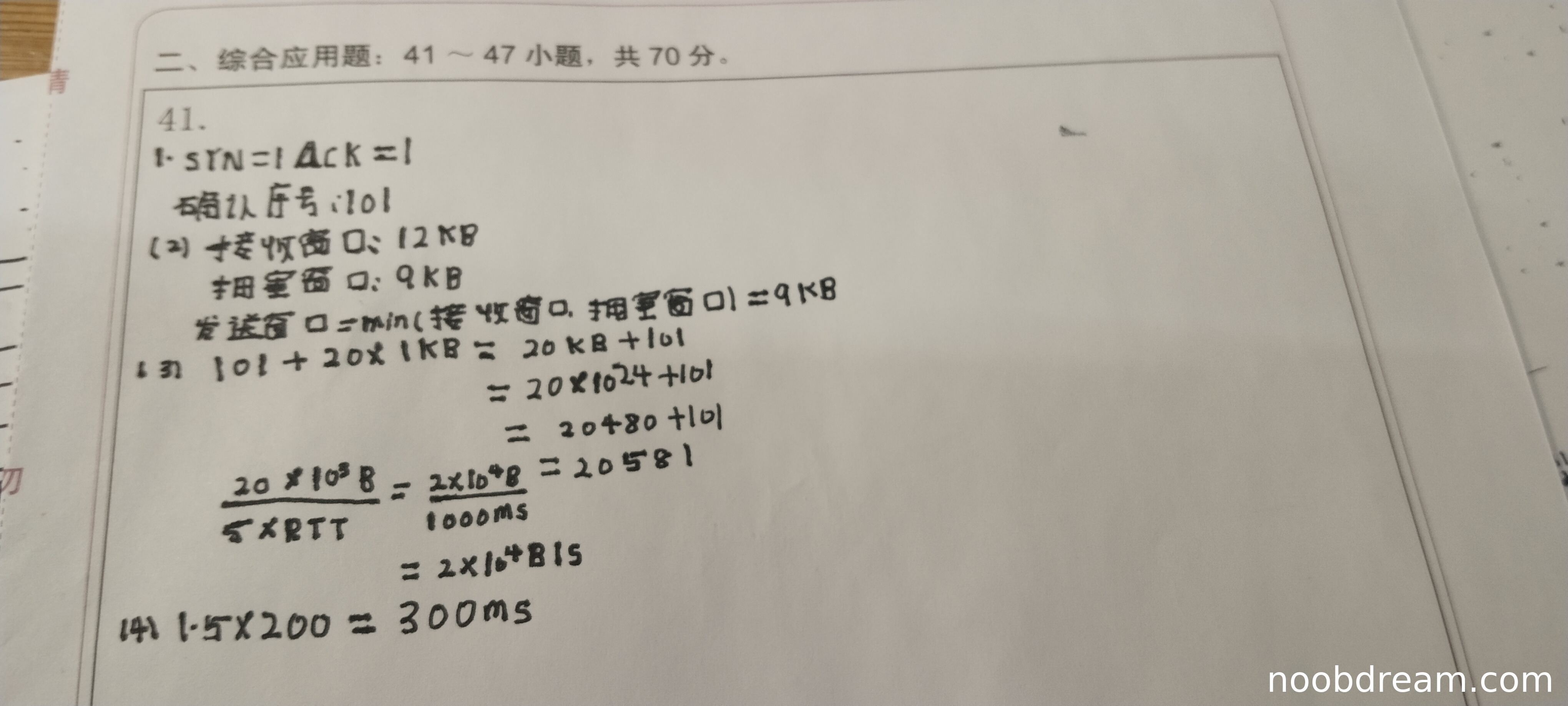 学生答案给出了下一个待发送段的序号为20581,与标准答案一致。但在计算平均数据传输速率时,答案中出现了“2×10^{4}B/s”的表述,这与标准答案的20.48 kbps(即20480 bps或2560 B/s)在数值和单位上均不符,属于逻辑错误。因此,序号部分正确,速率部分错误。序号部分占1分,速率部分占1分,扣1分。得1分。