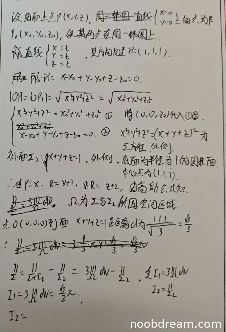1. 圆锥底面半径计算错误:学生错误地认为补面Σ₂(平面x+y+z=1)上的圆盘半径为1,中心为(1,1,1)。这是错误的。实际上,该圆是圆锥与平面的交线,其圆心应为直线x=y=z与平面的交点(1/3,1/3,1/3),半径应为√(2/3)=√6/3。学生的错误导致后续体积计算错误。