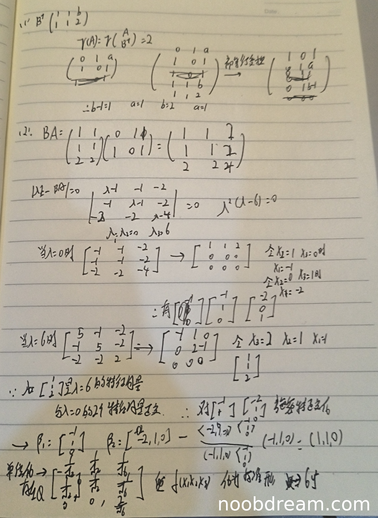 后续求特征值部分,第一次识别中特征方程基于错误的 \(BA\) 矩阵计算,但巧合地得到了正确特征值 \(\lambda^2(\lambda-6)=0\);第二次识别中基于正确的 \(BA\) 矩阵计算,...