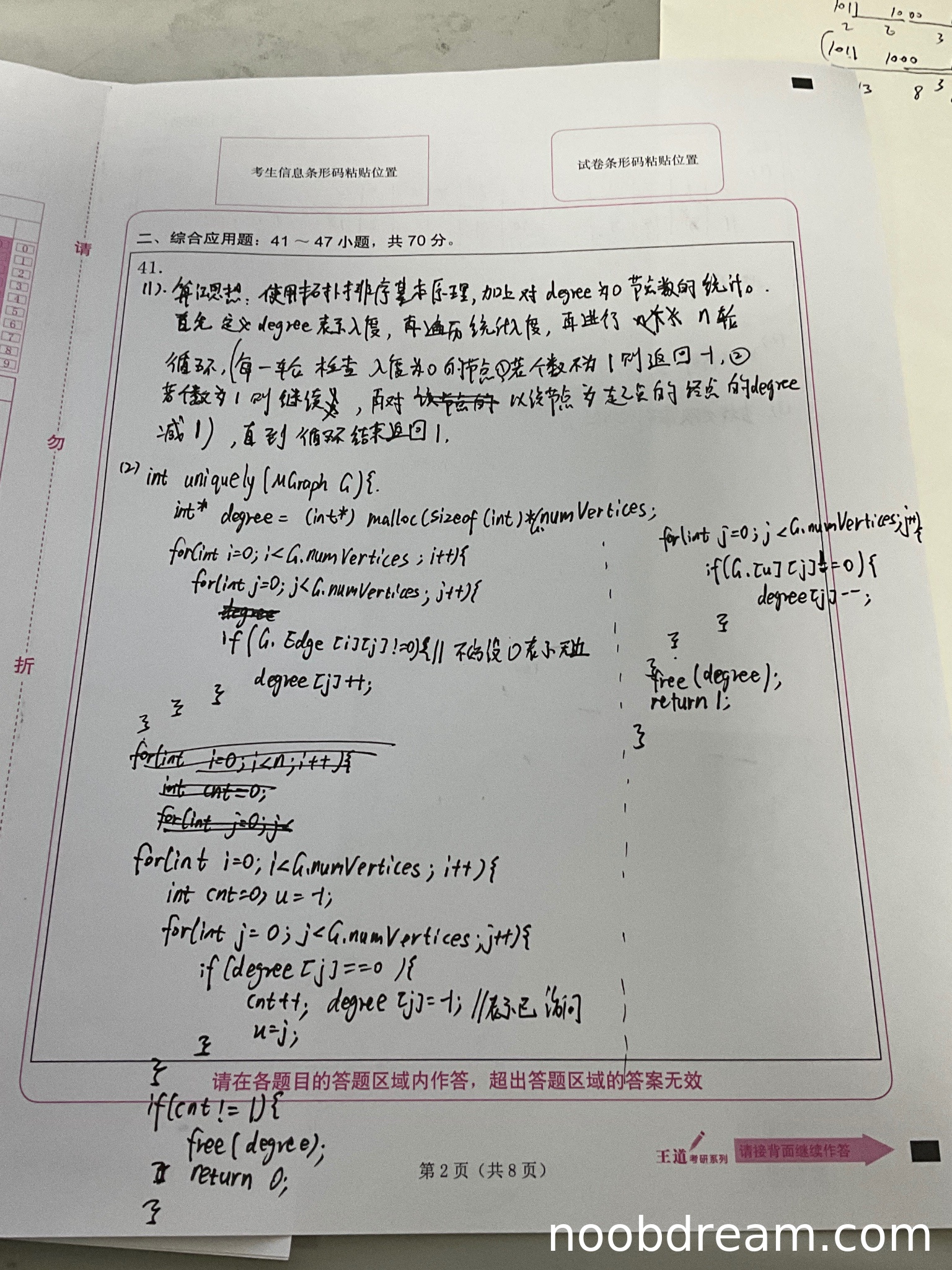 G.Tu[i][j],这可能是识别错误或笔误,根据上下文应为G.Edge[i][j]。但该段代码逻辑上重复了入度计算和减操作,且第二个双重循环(对G.Tu的操作)意图不明,与拓扑排序过程不符,属于逻辑错误。u进行“移除”操作(即将其邻接点的入度减1),这导致拓扑排序无法正确推进,属于关键逻辑缺失。由于存在明显的逻辑错误(未正确实现拓扑排序的节点移除步骤),且代码部分关键操作缺失,扣分较多。但考虑到学生正确表达了算法思想,且部分代码框架正确(如入度计算、查找入度为0节点),给予部分分数。扣分点:逻辑错误(未实现邻接点入度更新)扣4分;代码结构混乱、存在未定义变量扣2分。得3分。