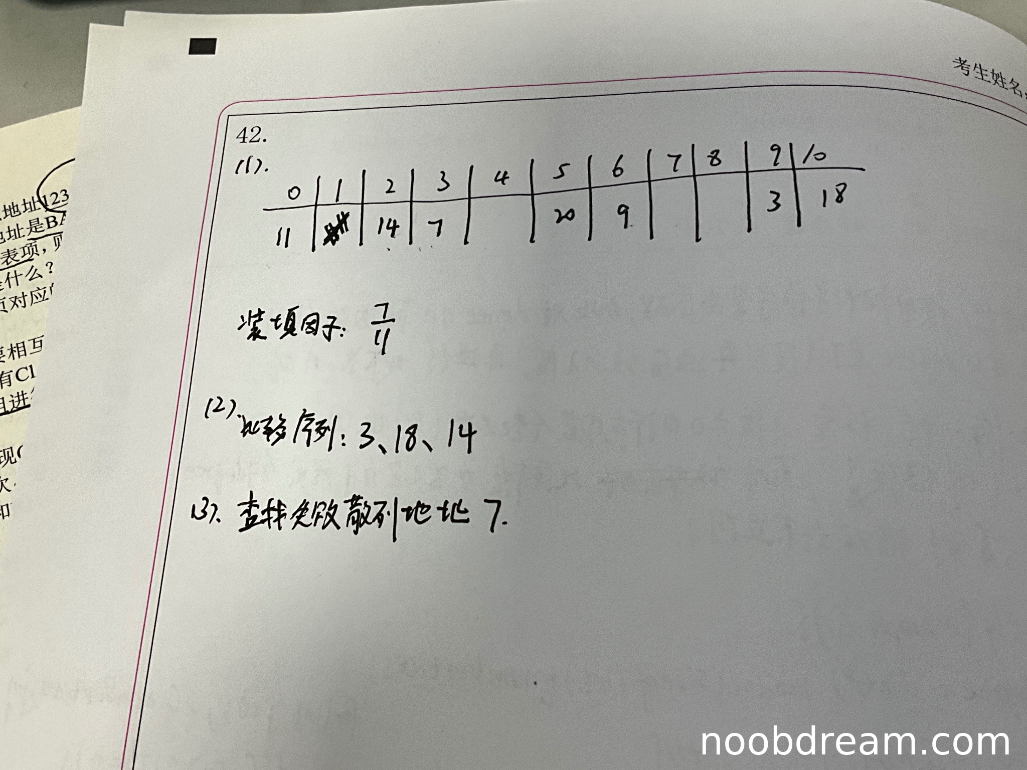 学生答案给出了散列表的最终状态表格,表格内容与标准答案完全一致(关键字位置:0-11,1-空,2-14,3-7,4-空,5-20,6-9,7-空,8-空,9-3,10-18)。装填因子计算正确,为7/11。因此该部分得满分6分。
