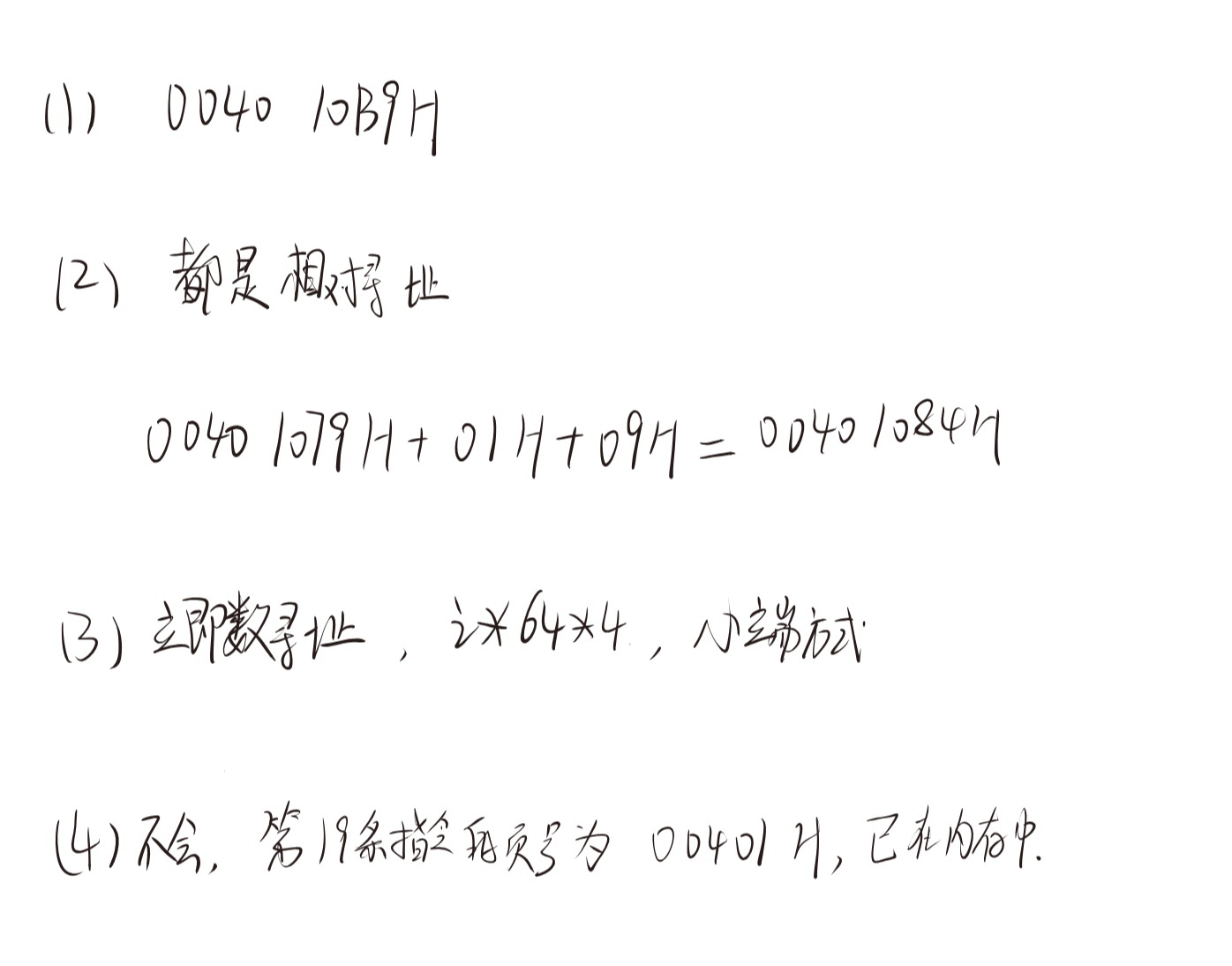 第二问计算过程有误。标准答案中,下一条指令地址应为当前指令地址+指令长度(2字节),即00401079H+2H=0040107BH。学生计算中使用了“+01H”,这是错误的,应扣1分。但考虑到学生最终计算出的目标地址正确(0040 1084H),且“+01H”可能是对PC自增过程(PC+1)的误写或识别错误,根据“禁止扣分”原则中关于误写不扣分的规定,此处不扣分。因此第二问得2分。