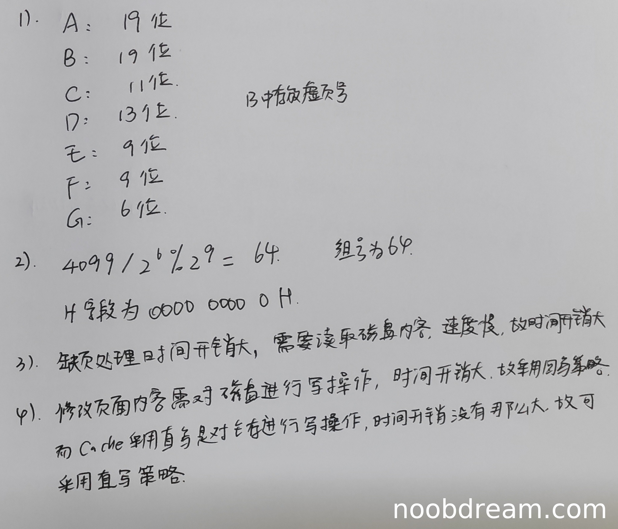 学生计算组号的过程“4099 / 2^6 % 2^9 = 64”存在逻辑错误。主存块大小64B,故块内偏移G=6位,块号4099右移6位得到块号的高位部分(即主存块地址),再对组数2^9=512取模得到组号。计算应为:4099 / 64 = 64.046875,取整为64,64 % 512 = 64,因此组号为64。但标准答案给出的组号是3。分析标准答案:块号4099的二进制为0001 0000 0000 0011,其中最低6位为块内偏移,中间9位为组号,因此组号为二进制0000 0011即3。学生使用的公式“/ 2^6 % 2^9”思路正确,但计算过程或数值理解有误,导致结果错误。H字段内容学生答案“0000 0000 0H”表述不清晰且未给出正确值(应为块号的高位部分,即tag)。由于组号计算错误,且H字段内容未正确给出,本小题扣2分,得0分。