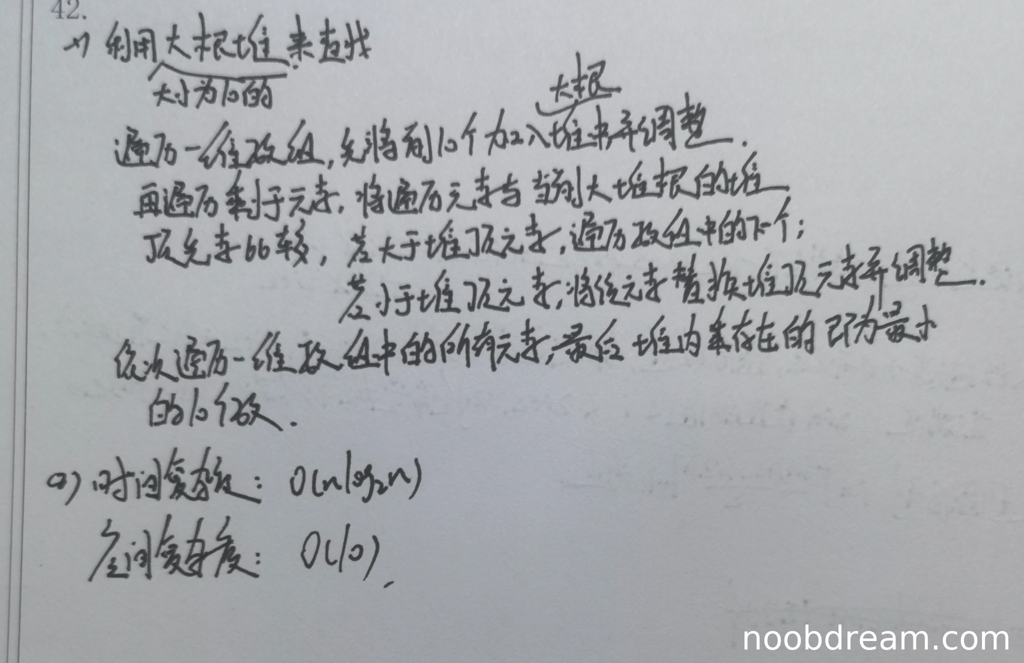 时间复杂度分析:建大小为10的堆为常数时间O(1)。后续遍历n-10个元素,每次与堆顶比较为O(1),若需要替换并调整堆,调整操作的时间复杂度为O(log10)。因此,总时间复杂度为O(n * log10) = O(n),因为log10是常数。学生写作O(nlog10)在渐进意义上等价于O(n),但严格写法应为O(n)或O(nlogk),其中k=10。考虑到这是对常数规模堆的操作,且核心思想正确,此处不扣分。