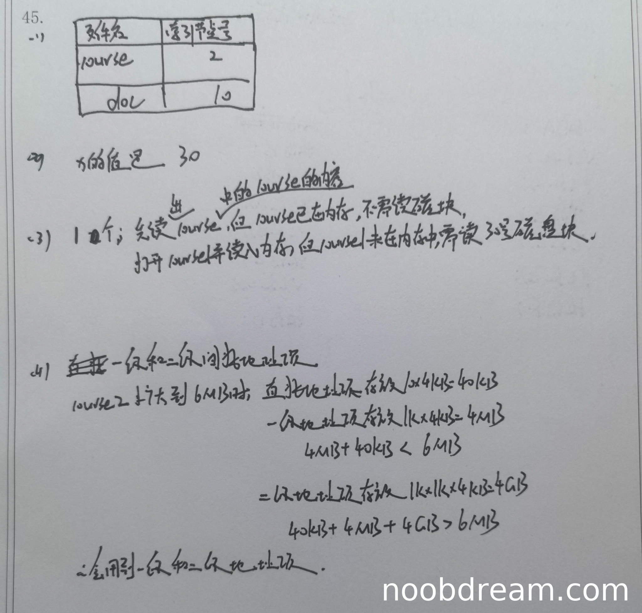 学生答案存在逻辑错误。问题(3)问的是打开并读入文件course1需要读几个磁盘块。标准答案分析是:目录course已在内存,所以无需读取;需要先读course1的索引节点(10号)所在的磁盘块,再读其内容(30号)所在的磁盘块,共2块。学生第一次识别结果说“需读3个磁盘块”,第二次识别结果说“需读3次磁盘块”,且理由混乱(提到了doc,而题目是course1)。因此,答案错误。扣2分,得0分。