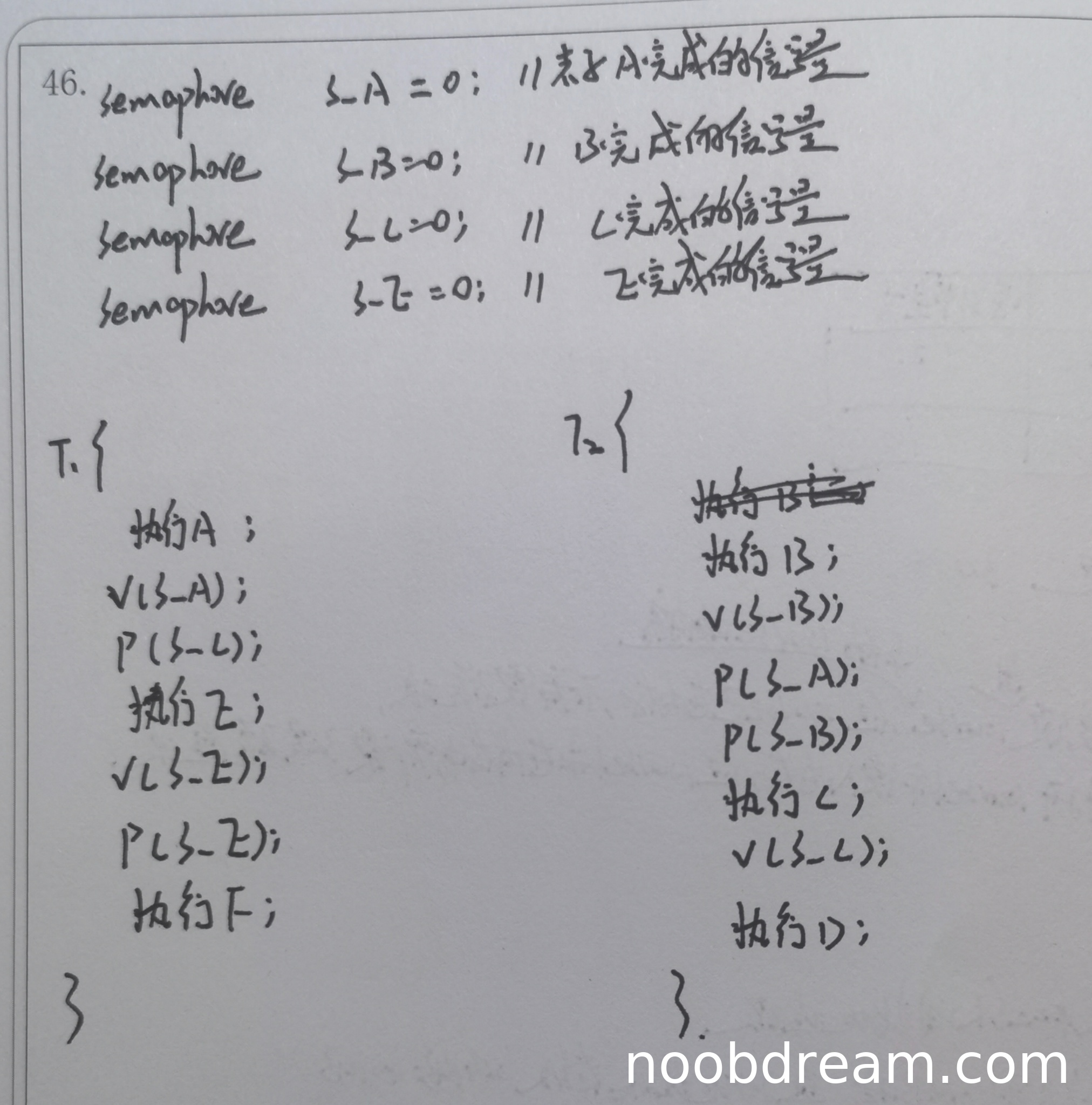 学生答案整体逻辑正确,实现了题目要求的同步关系:C等待A和B完成,E等待C完成,F等待E完成。学生使用了四个信号量S_A、S_B、S_C、S_E(或s-A、s-B、s-C、s-E),其初值均为0,作用分别是表示对应操作完成。代码中,T1执行A后V(S_A),然后P(S_C)等待C完成,之后执行E、V(S_E),再P(S_E)等待自己发出的信号(此P(S_E)是多余的,但不会导致错误,因为E完成后立即V(S_E)然后P(S_E),这会使F立即执行,实际上F等待E完成的约束仍满足,只是多了一次无意义的等待-唤醒;不过从严格同步角度看,这里P(S_E)应在V(S_E)之后,且应由F来执行P(S_E),学生将P(S_E)放在T1中E之后、F之前,虽然顺序奇怪,但仍在同一线程中,不影响正确性,可视为冗余操作)。T2执行B后V(S_B),然后P(S_A)和P(S_B)等待A和B完成,之后执行C、V(S_C),然后执行D。整体同步关系正确,且信号量初值设置正确。