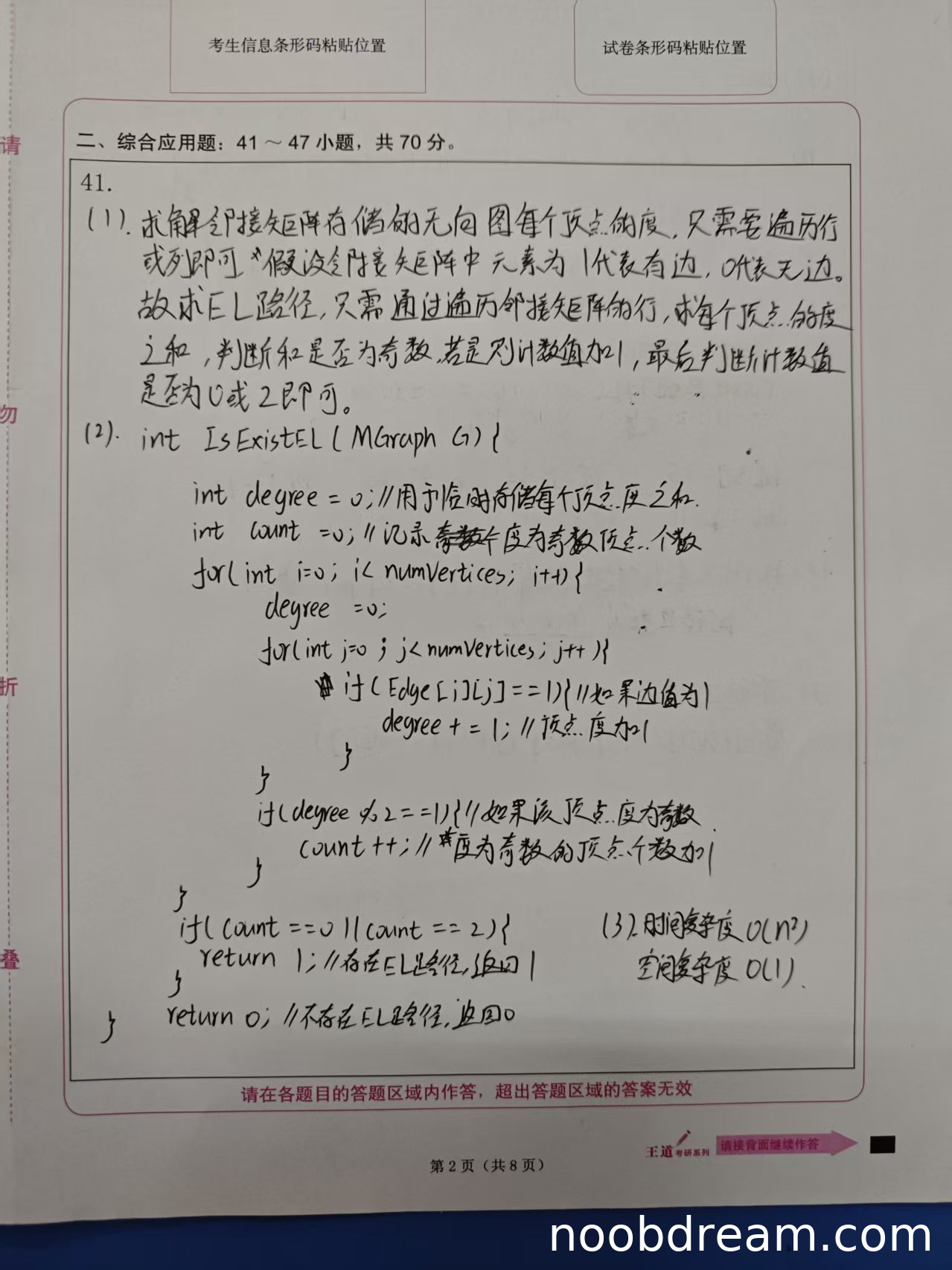 numVertices和Edge,这是结构体MGraph G的成员,应使用G.numVertices和G.Edge。这是一个关键性的逻辑错误,导致代码无法正确编译和运行。扣2分。(3)得分及理由(满分2分)