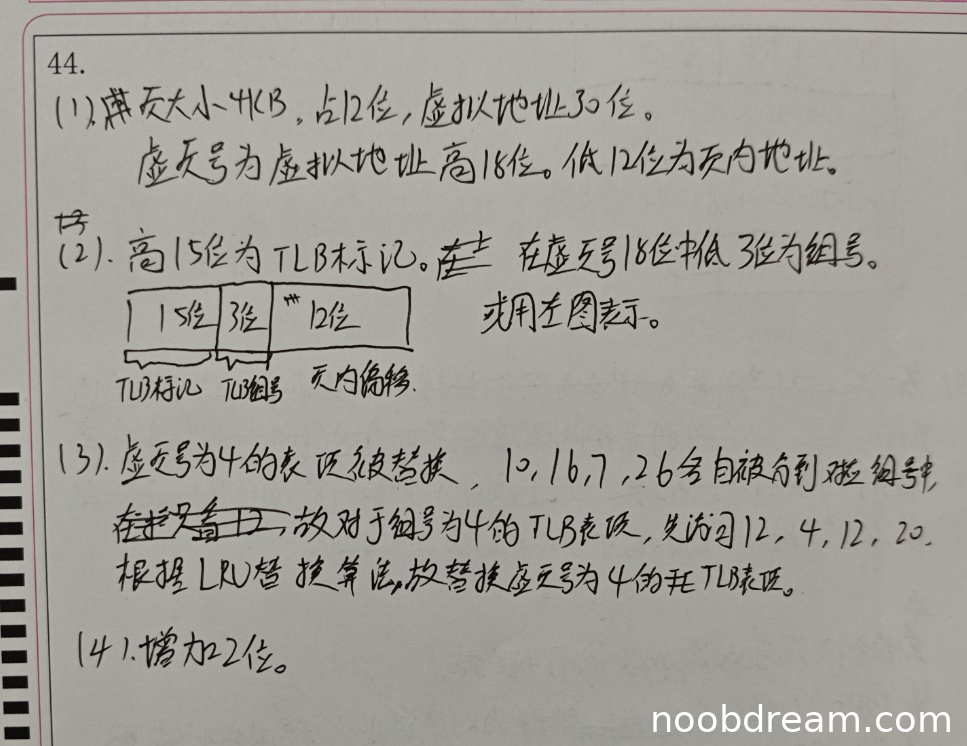 学生答案正确指出TLB标记为高15位,TLB组号为虚页号中低3位(即虚拟地址中间3位)。与标准答案一致。得2分。