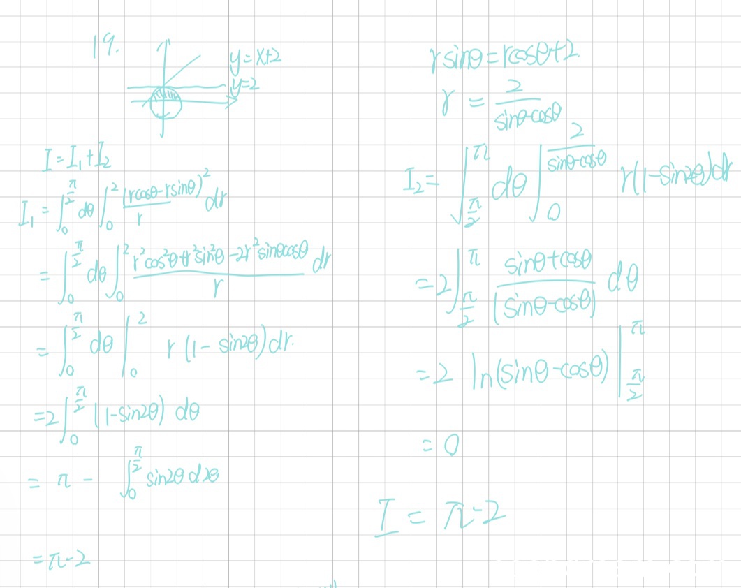 具体错误:在 I₂ 的积分表达式中,学生写为 ∫∫ r(1 - sinθ) dr dθ,但根据被积函数 (cosθ - sinθ)² 在极坐标下应为 (cosθ - sinθ)² · r dr dθ,因此内层对 r 积分后应为 (1/2) r²,但学生错误地将被积函数写成了 r(1 - sinθ),这导致后续计算完全错误。尽管后续积分计算在形式上进行了,但由于被积函数错误,整个 I₂ 的计算无效。标准答案中 I₂ 部分积分结果为 π,而学生得到 0,因此 I₂ 部分不能得分。