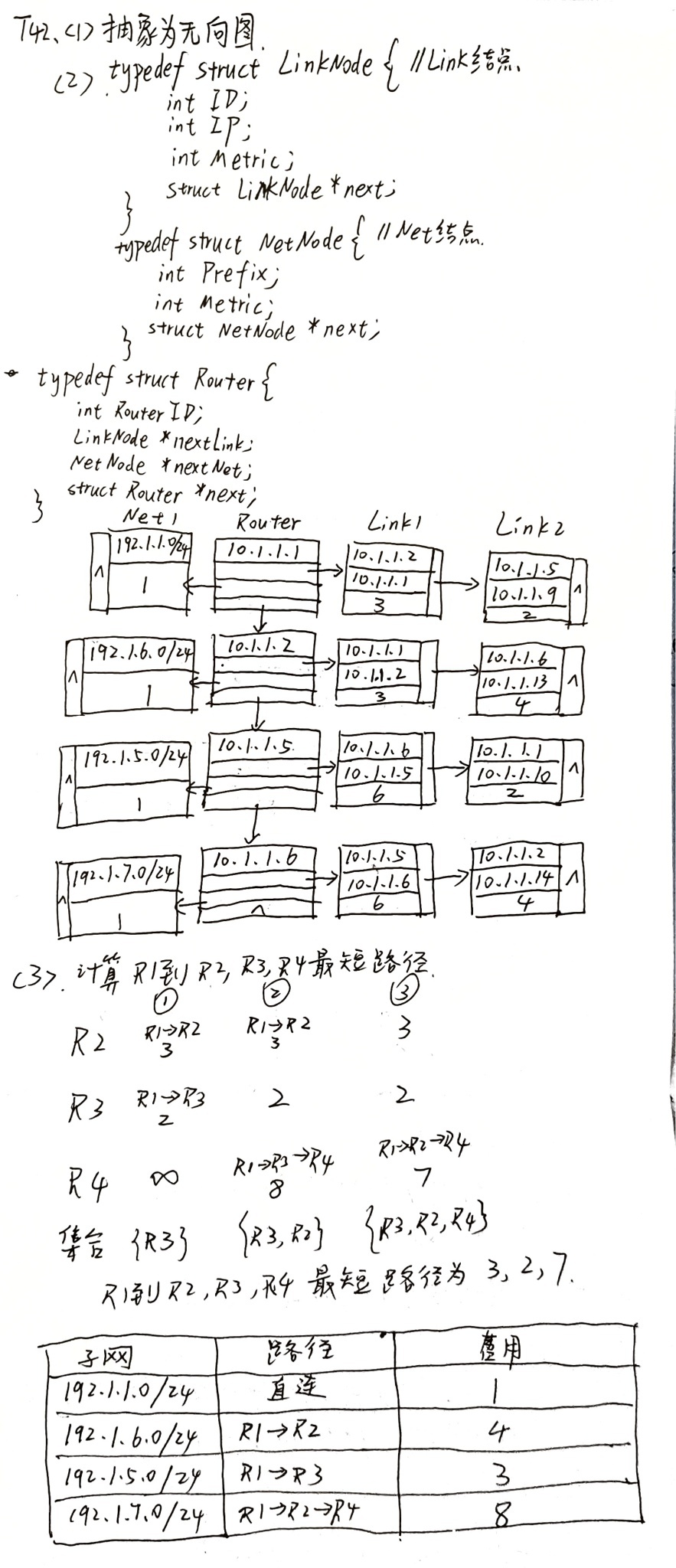 学生设计了链式存储结构,定义了Router、LinkNode、NetNode三种结构体。其思路与标准答案中“采用两种不同的结构分别表示 Link 和 Net,同时在表头结点中定义了两个指针,分别指向由这两种类型的结点构成的两个链表”的描述一致,符合评分说明②,属于可行的链式存储结构。数据定义基本正确,能保存所需信息。给出的示意图(表格形式)虽然细节不够清晰,但体现了链式存储的意图和网络连接关系,符合评分说明⑤。因此,本部分可得5分。