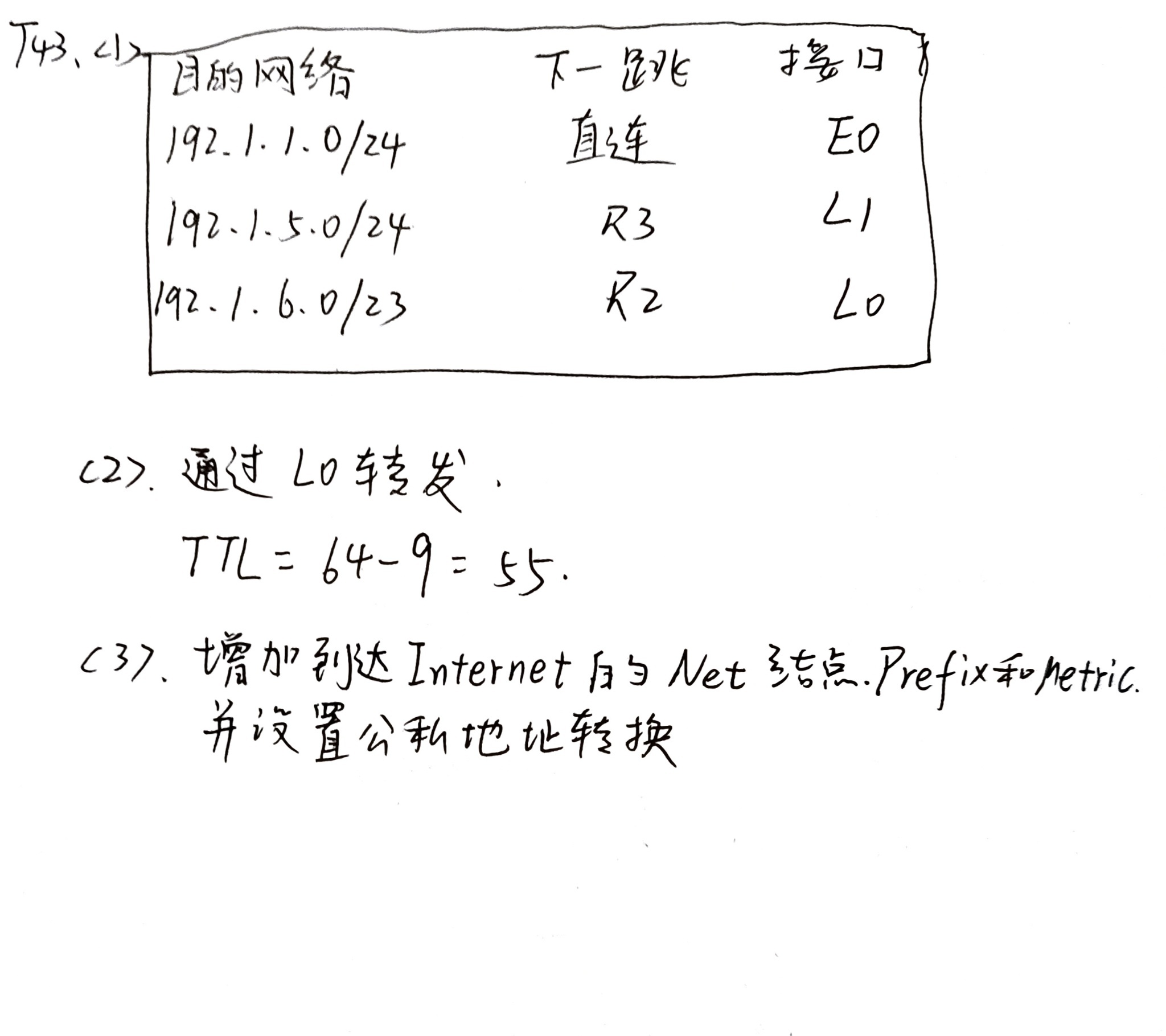 ③ 192.1.6.0/23,下一跳为R2,接口L0。标准答案为10.1.1.2,L0。学生答案的“R2”在上下文中可以理解为指向R2(其地址为10.1.1.2),思路正确,不扣分。此条正确,得2分。