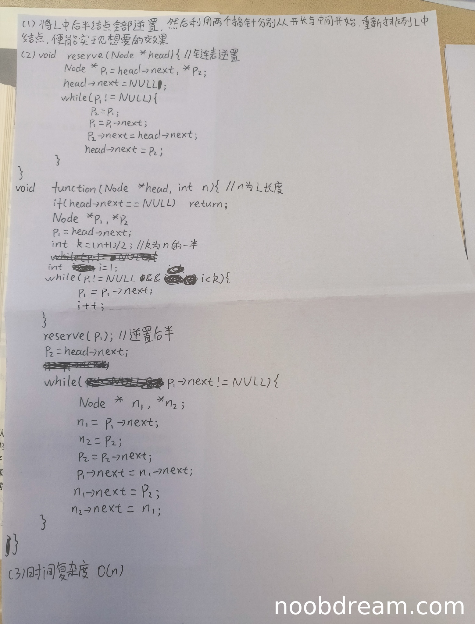 function中,参数head是带头结点的单链表头指针,但reserve(P1)调用时,P1此时指向的是前半部分的最后一个结点(即第k个结点),而reserve函数期望传入的是带头结点的链表头指针。这里直接传入P1会导致逆置操作错误,因为P1作为“头结点”使用,但实际它只是一个普通结点,其next指向后半部分的第一个结点。标准答案中是将后半部分断开并反转,而学生代码没有显式断开,且reserve函数会改变传入头结点的next指向,这里逻辑不清晰,会导致链表连接错误。while(P1->next!= NULL)存在问题:当后半部分逆置后,P1指向的是原后半部分的最后一个结点(即逆置后的第一个结点),而循环中P1->next可能会提前变为NULL,导致合并不完整。标准答案中是用两个指针分别遍历两个链表直到后半部分链表为空。n1->next = P2;和n2->next = n1;的意图是交替插入,但逻辑与标准答案不同,且未正确处理前后连接。由于存在明显的逻辑错误(尤其是逆置和合并部分),扣分。考虑到学生整体思路正确,但实现有缺陷,给予4分(扣4分)。