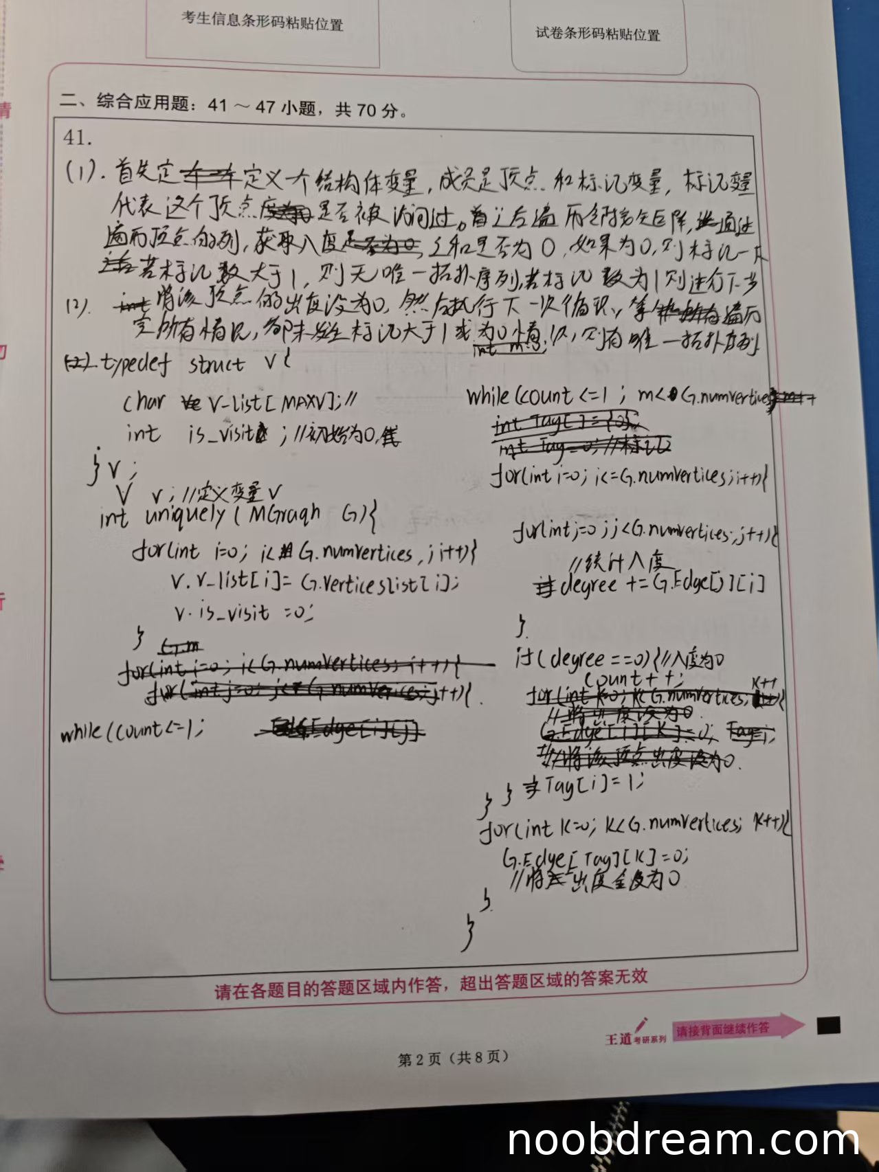 理由:学生的基本设计思想提到了“遍历顶点的列,获取入度是否为0”,这与标准答案中计算入度的思路一致。同时,学生也提到了“如果标记数大于1,则无唯一拓扑序列”,这与判断唯一性的核心思想(每一步只能有一个入度为0的顶点)相符。但是,学生的描述较为混乱,没有清晰说明拓扑排序的迭代过程(如每次移除一个入度为0的顶点并更新其他顶点的入度),也没有明确说明如何初始化入度数组以及如何处理没有入度为0顶点的情况(即存在环)。因此,只能给部分分数。