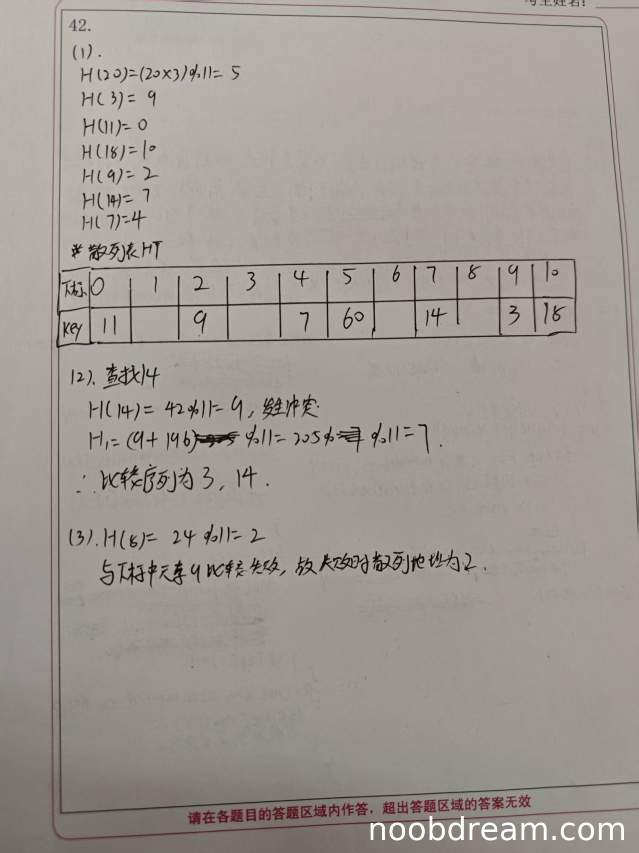 - 关键字14的初始地址应为(14*3)%11=9,学生错误计算为7,且未进行正确的二次探查。