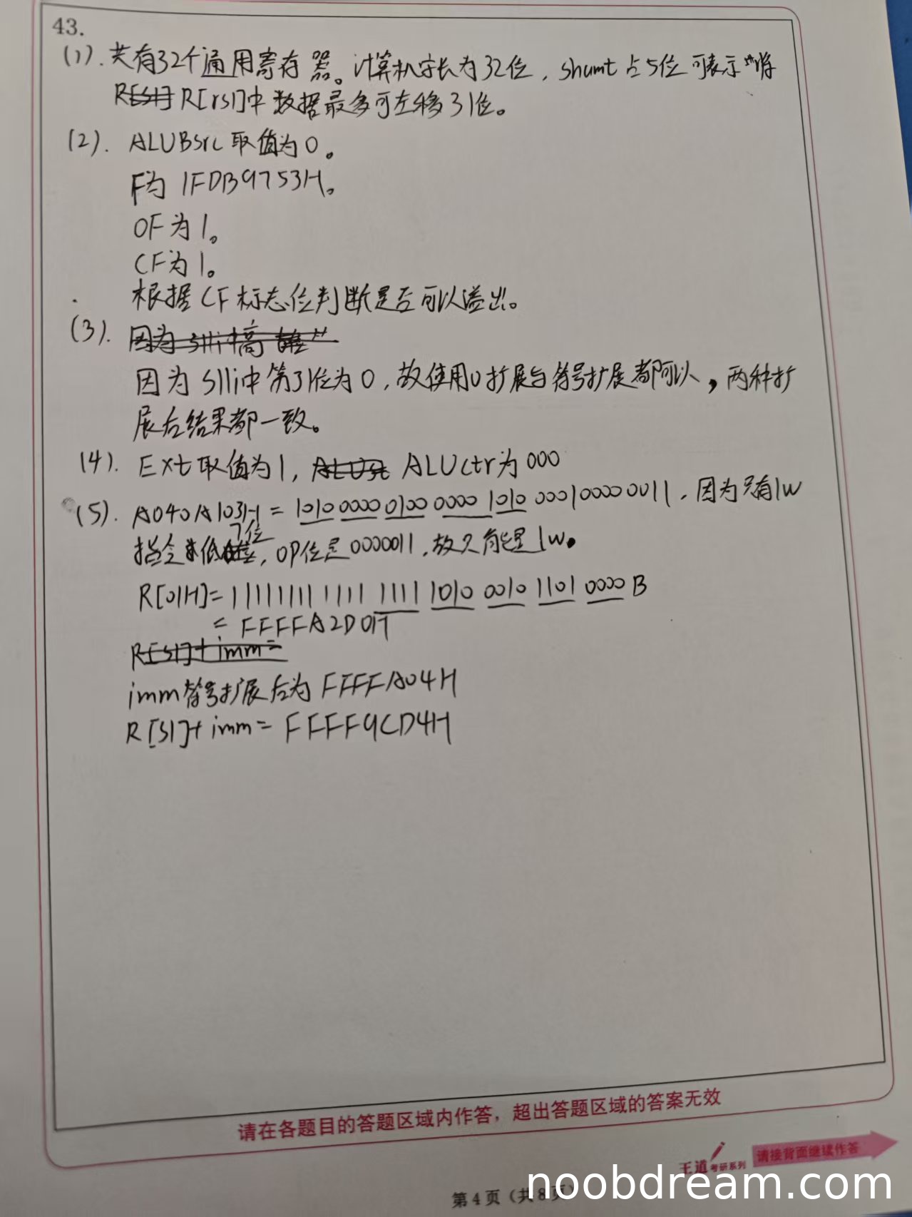学生将机器码转换为二进制,并指出“只有lw指令最低6位,OP位是000011,故只能是lw”。虽然学生将“最低7位”误写为“最低6位”,但根据上下文及两次识别结果,其核心逻辑(通过操作码字段识别指令类型)正确,且识别结果中操作码部分正确,因此不扣分。本小题得2分。