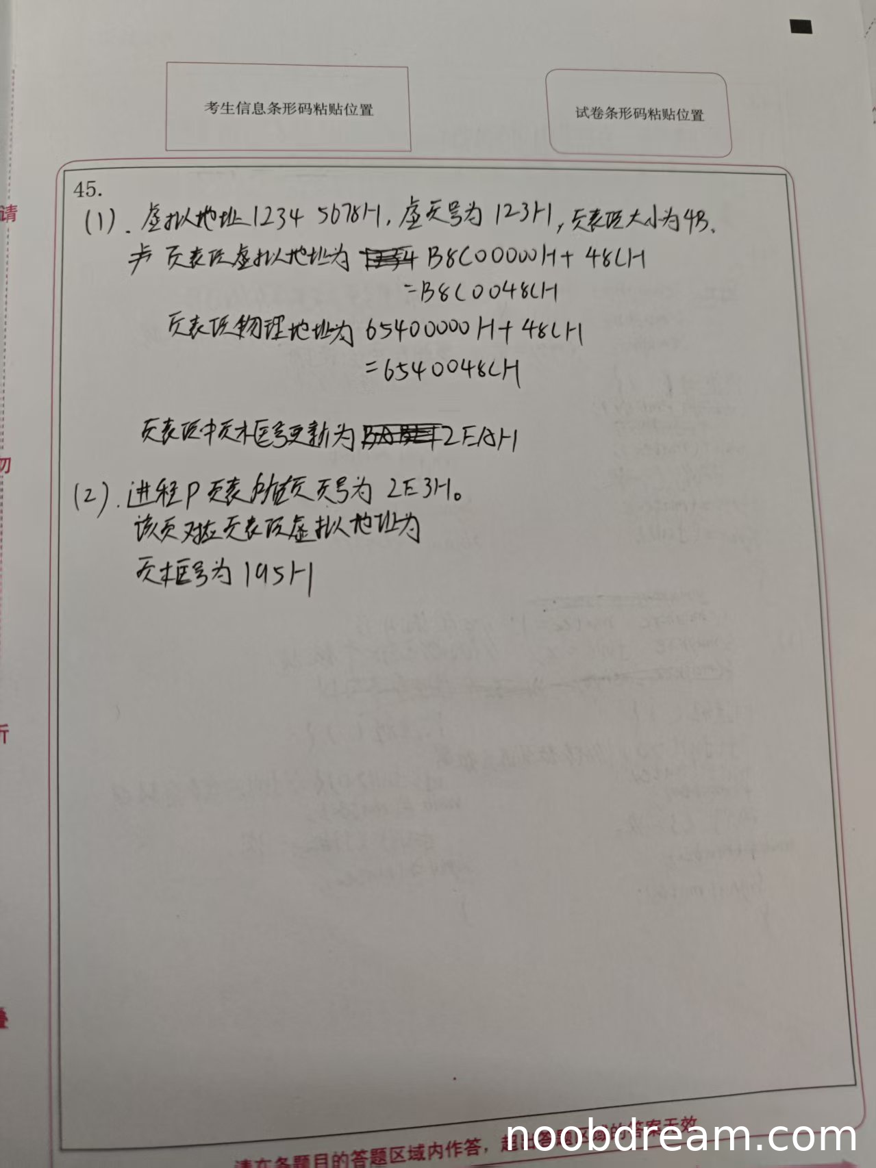 学生答案中,第一次识别结果页表项虚拟地址和物理地址计算有误(偏移量计算错误,且未乘以页表项大小4),且页框号未给出。第二次识别结果中,页表项虚拟地址和物理地址计算仍然有误(偏移量计算错误,且未乘以页表项大小4),但页框号2EAH正确。根据标准答案,正确计算应为:页表项虚拟地址 = B8C0 0000H + 048H * 4 = B8C0 0120H,物理地址 = 6540 0000H + 048H * 4 = 6540 0120H,页框号 = 2EAH。学生答案中地址计算逻辑错误,但页框号正确。考虑到识别可能存在的字符误写(如将“0120”识别为“0048”或“0048C”),且核心结果页框号正确,但地址计算步骤存在明显逻辑错误(未正确计算偏移量),因此扣除部分分数。得分:1分(主要给页框号正确部分的分)。