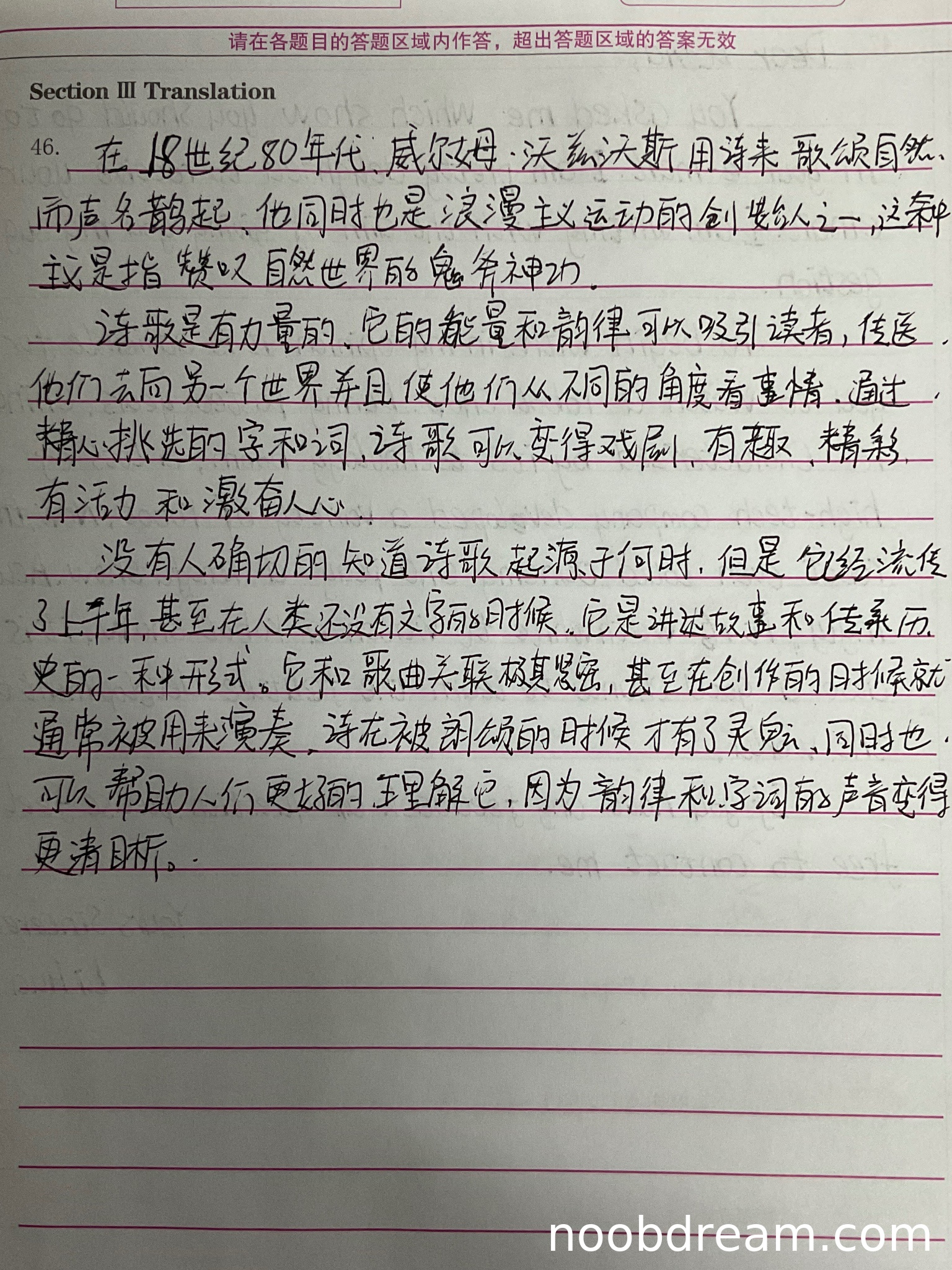 第三段翻译基本准确,但有少量信息偏差和逻辑瑕疵。“even before people could write”译为“甚至在人类还没有文字的时候”,将“write”(书写)扩大为“文字”(书写系统),存在细微的信息失真,扣1分。“it is usually created to be performed out loud”译为“甚至在创作的时候就通常被用来演奏”,将“performed out loud”(出声表演/朗诵)译为“演奏”,用词不...