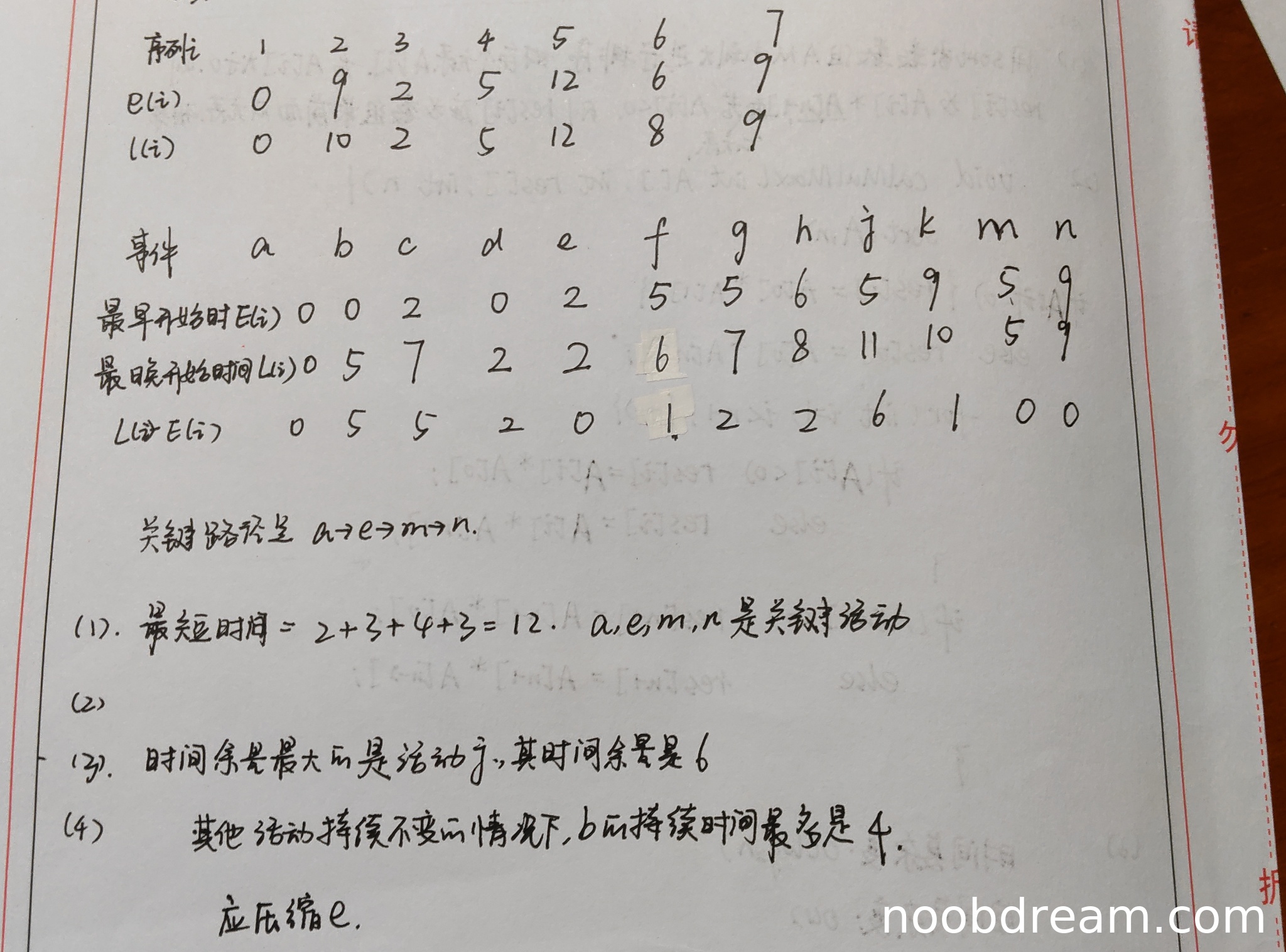 学生答案中正确计算出最短时间为12,并正确指出关键活动为a、e、m、n。与标准答案完全一致。得3分。