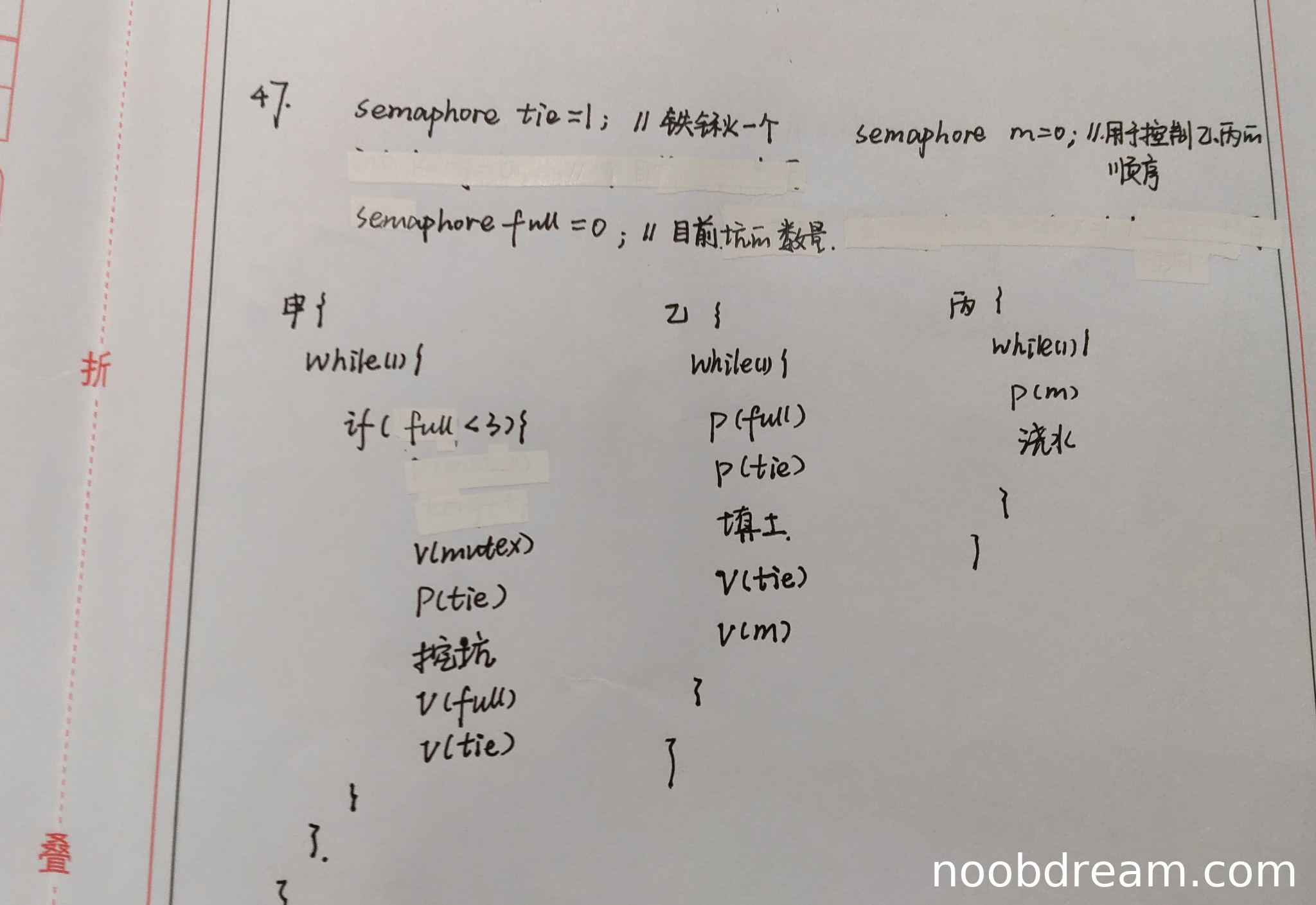 - 甲:通过if(full<3)判断,但full是信号量,不能直接作为整数比较,这是严重逻辑错误,会导致甲无法开始工作(因为full初值为0,P(full)未执行,full值始终为0,但比较操作不合法)。应使用一个计数信号量或变量来记录已挖坑数。此处扣2分。