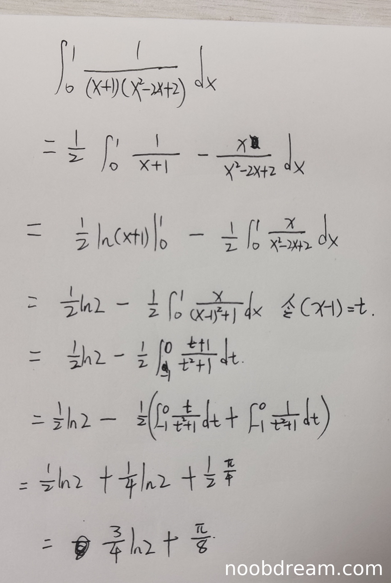 这与原被积函数 \(\frac{1}{(x+1)(x^2-2x+2)}\) 不相等。因此,从第一步开始就存在根本性的逻辑错误(部分分式分解错误),导致后续所有计算基于一个错误的起点。尽管后续积分技巧(如换元、拆项积分)本身无误,但由于起点错误,最终答案错误。