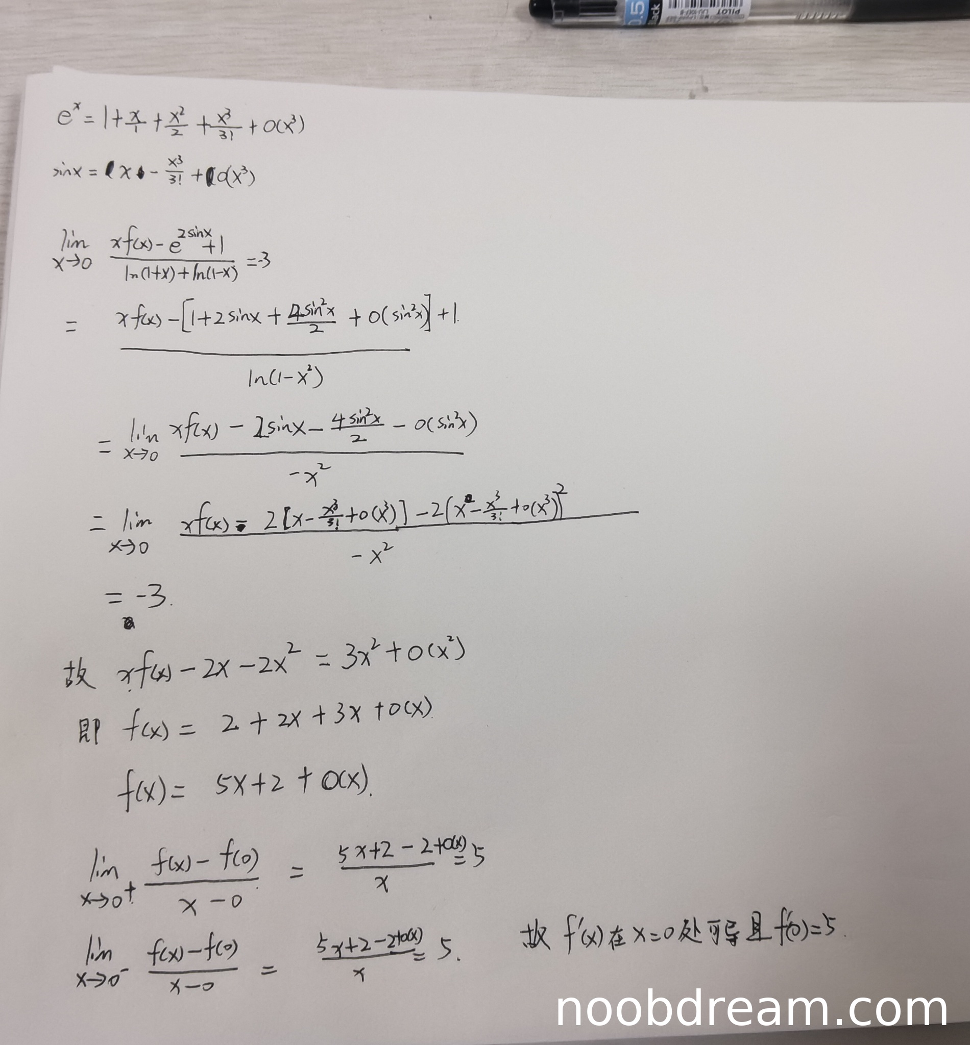 学生作答分为两次识别,但两次识别内容本质是同一解答过程。整体思路正确:利用等价无穷小展开分母和分子中的指数函数,通过极限存在性推导出 \(f(x)\) 在 \(x=0\) 处的函数值和导数值。具体步骤中,学生正确写出 \(\ln(1+x)+\ln(1-x) \sim -x^2\),并将 \(e^{2\sin x}\) 展开到二阶,然后通过极限等式求出 \(f(x)\) 的渐近表达式,进而得到 \(f(0)=2\) 和 \(f'(0)=5\)。虽然过程中出现了一些笔误(如极限值写为3而非-3,以及展开式系数的小错误),但根据“误写不扣分”原则,这些不影响核心逻辑。然而,学生在推导过程中存在一处关键逻辑错误:在第一次识别结果的第5行,将极限值写为-3,但后续推导中却直接令化简后的表达式等于-3,而实际上根据展开式,分子分母化简后应得到关于 \(x\) 的二次项系数关系,学生直接令 \(xf(x)-2x-2x^2 = 3x^2 + o(x^2)\),这一步缺乏严格的极限运算过渡,属于逻辑跳跃。在第二次识别中,同样存在类似问题:在化简后直接令 \(\lim_{x\to0}\frac{xf(x)-2x-2x^2}{-x^2}=3\),而根据题目条件,该极限应为-3,但学生误写为3,且未严格说明分子中一次项系数必须为零的原因(实际上是因为分母为二阶无穷小,极限存在要求分子至少为二阶无穷小,从而一次项系数为零)。由于这一逻辑跳跃,扣2分。其余部分正确,包括最终导数值计算和可导性判断。因此,本题得分10分。